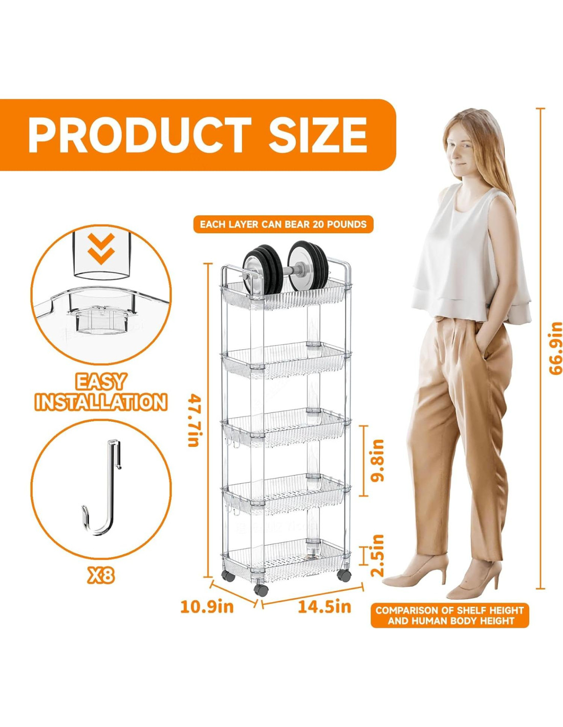 - Estante de almacenamiento de baño utilitario El organizador de carro rodante de 10.9'' (27,69 cm) de ancho y con 8 ganchos ofrece almacenamiento adicional, el espacio de almacenamiento ampliado puede colocar verduras, frutas, bocadillos, bebidas, herramientas, suministros de arte, cosméticos, artículos de tocador, juguetes de pañales, productos para bebés, etc.