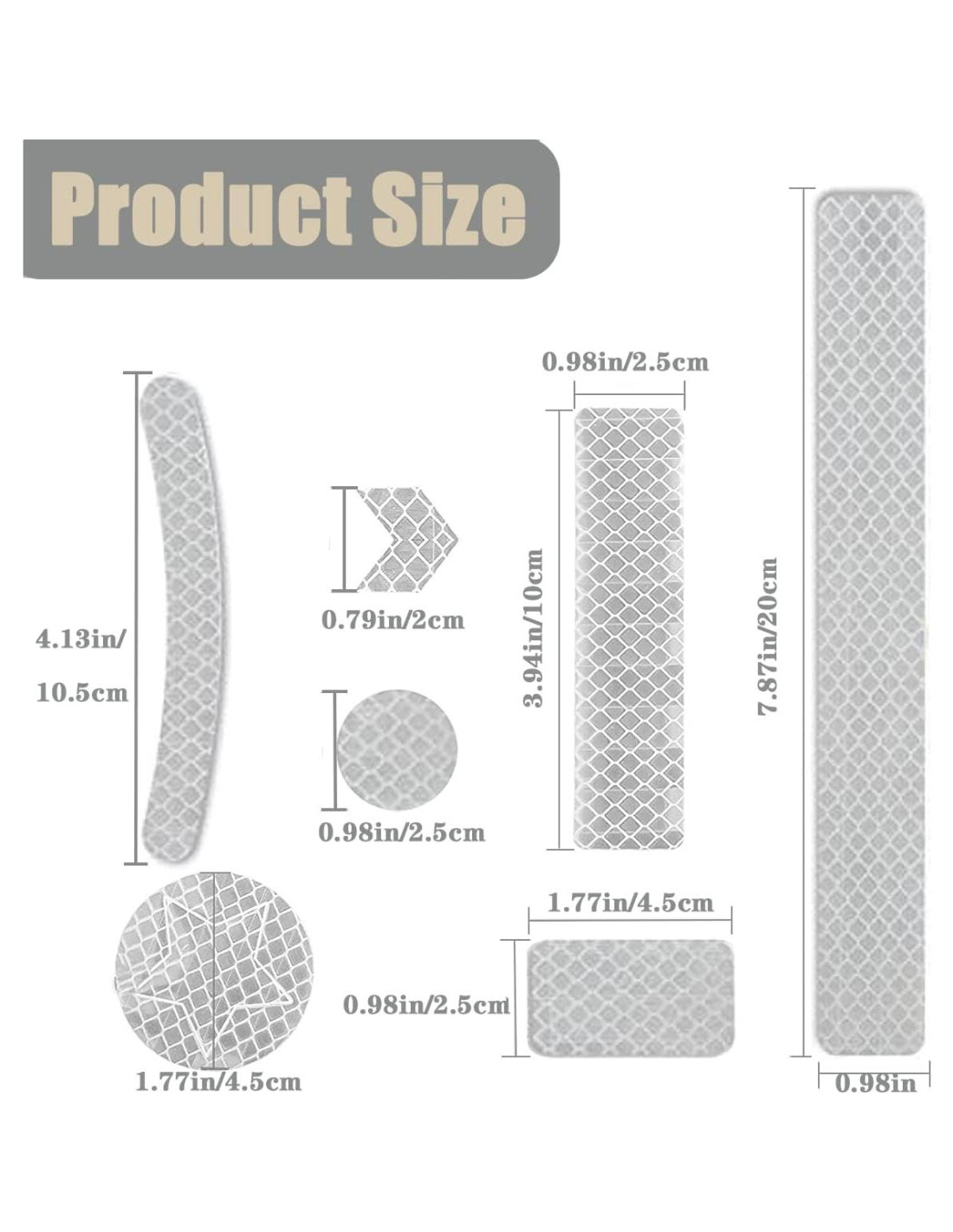 - Material premium: Hechas de material reflectante de alta intensidad, son duraderas y muy adhesivas, impermeables, no fáciles de romper o caer. Ni siquiera la nieve y el barro pueden dañar el reflector impermeable.