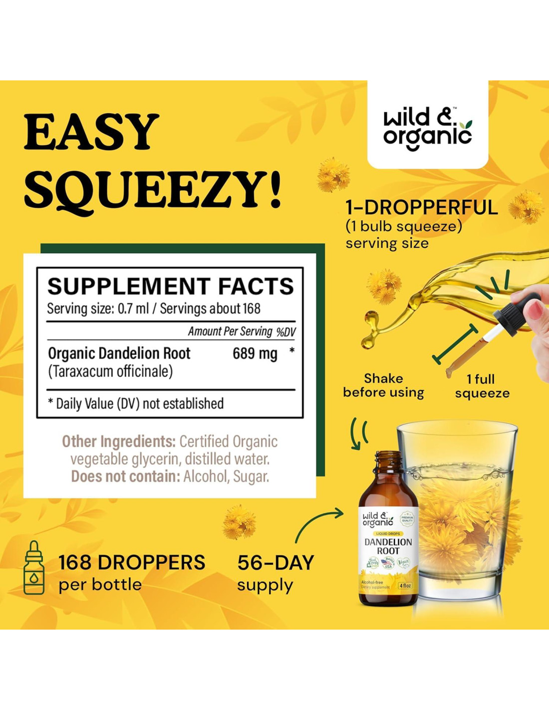 - Soporte Hepático de Raíz de Diente de León: Cada porción de tintura de raíz de diente de león silvestre y orgánica contiene 689 mg de extracto de raíz de diente de león para soporte hepático.