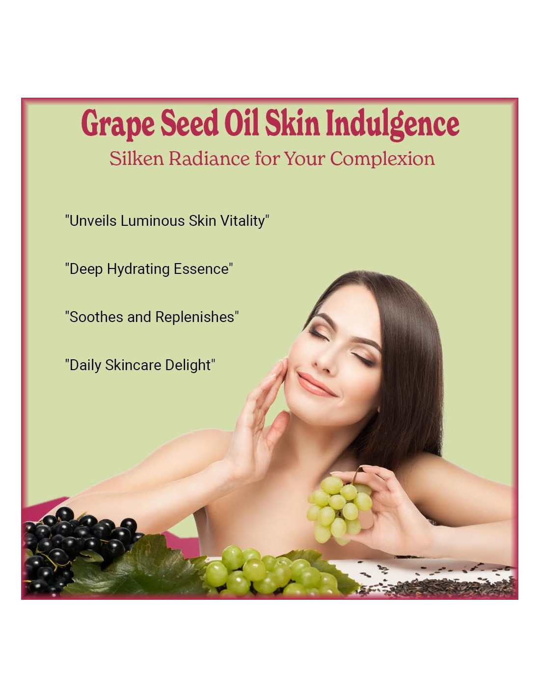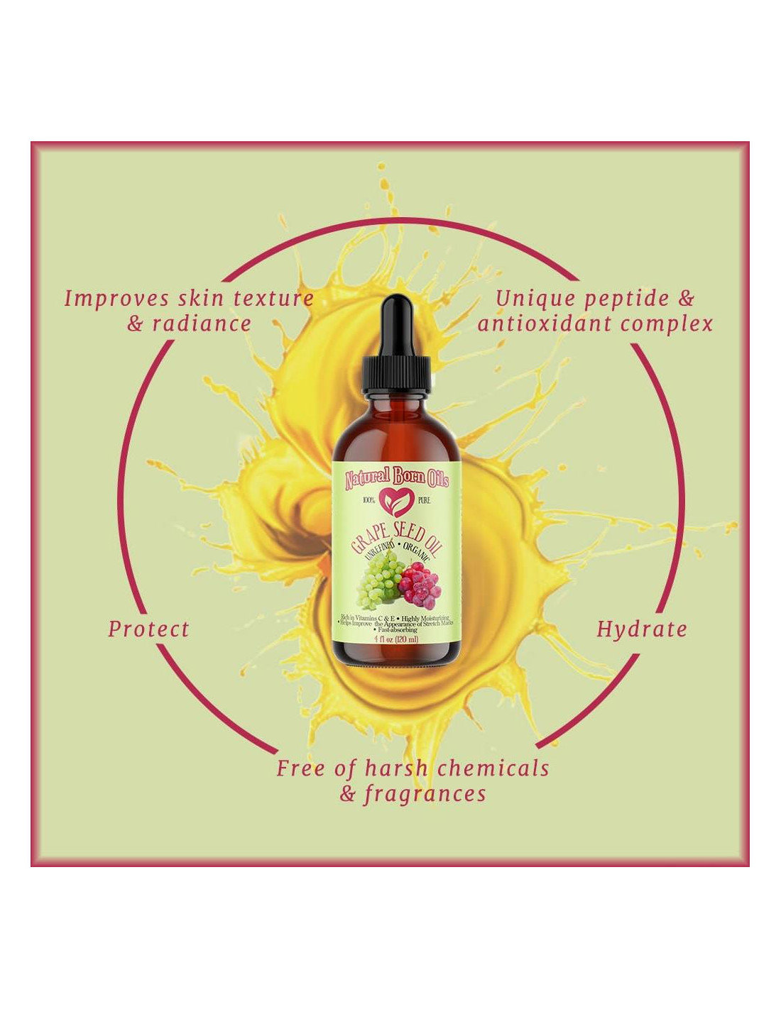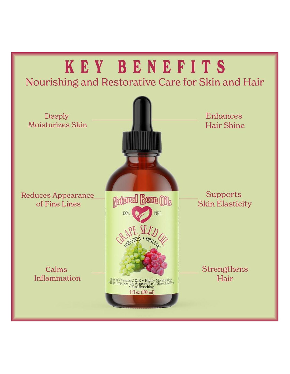 ACEITE DE SEMILLA DE UVA 100% PURO Este aceite es realmente algo. Ideal para aquellos con piel grasa, el Aceite de Semilla de Uva hidrata mientras mantiene un cutis equilibrado. Cargado con Vitamina E y ácidos grasos esenciales, este aceite ligero es perfecto para usar de pies a cabeza. 100% puro. Orgánico. Sin refinar. Prensado en frío. Natural. Vegano. Fácilmente absorbido. Altamente hidratante. Ligero. Libre de parabenos. Libre de hexano. Libre de sulfatos. Libre de colorantes. Libre de conservantes. Libre de aditivos. No probado en animales. Embotellado en EE. UU. Historia de Origen Las uvas fueron cultivadas por primera vez en el Cercano Oriente, pero ahora se cultivan en todo el mundo donde el clima lo permite. Las uvas son las bayas frutales de vides leñosas, y el aceite se deriva de las semillas de las bayas. El Proceso El aceite se prensa en frío a partir de la semilla de uvas. El proceso implica triturar y moler las semillas bajo una piedra de molino tradicional o en equipos de acero inoxidable y capturar el aceite resultante. La temperatura de procesamiento no puede superar los 49 grados C.