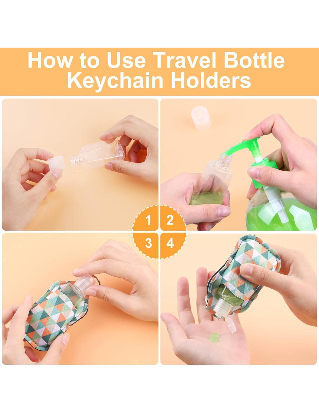 - Fácil de Usar: Las botellas de viaje vacías con soporte para llavero te permiten adjuntar los contenedores de botellas a tus llaves, billetera, bolso, mochila, bolsa de bebé, bolsa de gimnasio o incluso a tu cinturón, también puedes colgarlas directamente en tu mano como un adorno o guardarlas en tu bolsillo, hace que tu seguridad sea fácil
