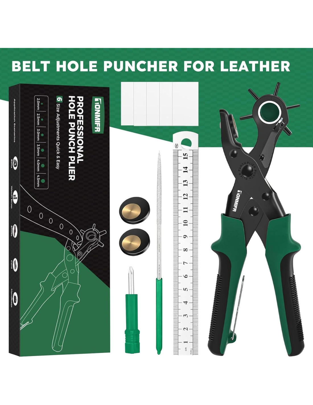 - Juego completo para perforación de cinturones y procesamiento de materiales Equipamiento perfecto con destornillador de almacenamiento y 5 tarjetas de configuración. Las pinzas perforadoras de cinturones compactas caben en cualquier caja de herramientas para reparaciones de emergencia de arneses para perros, lonas o muebles tapizados.