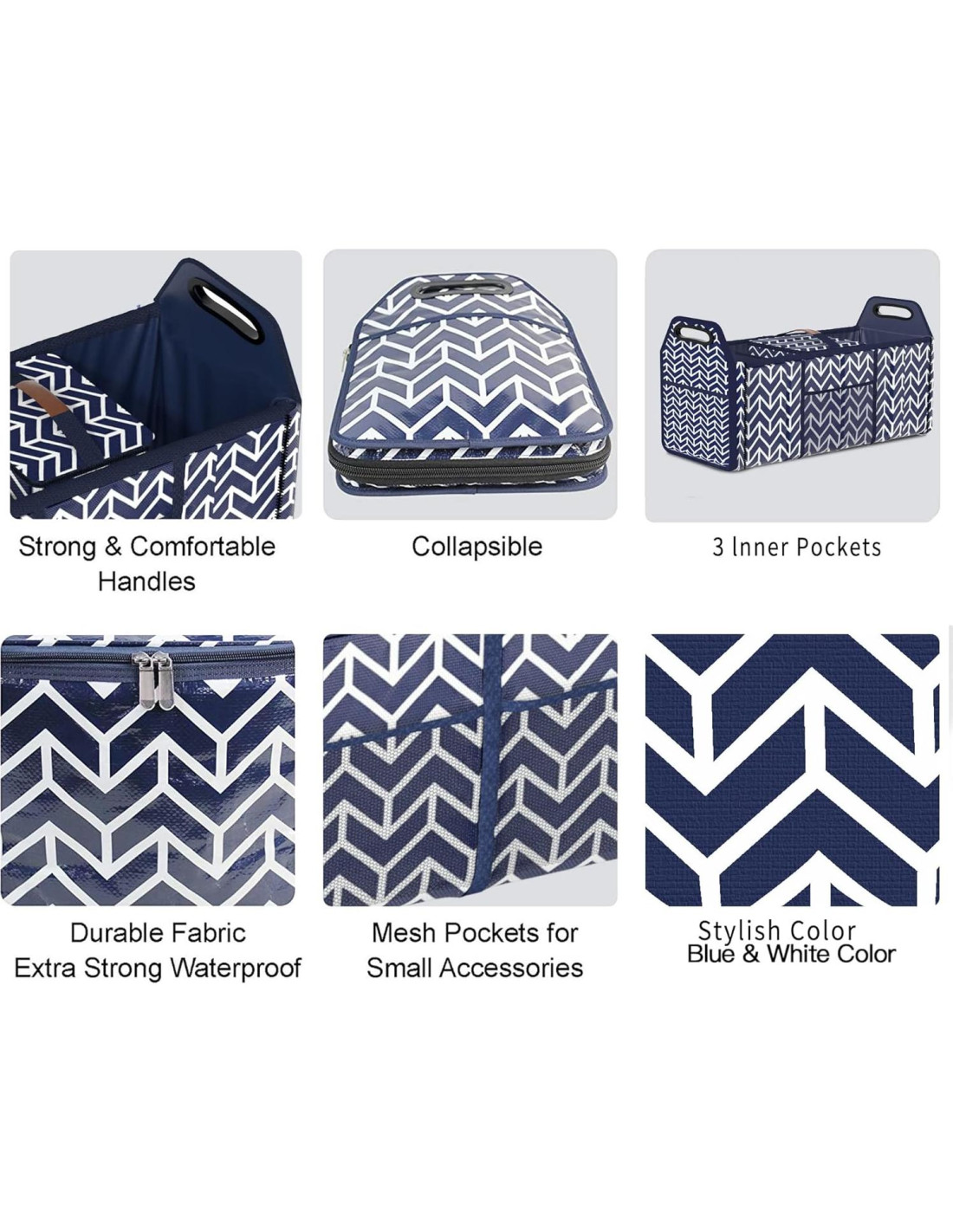 - Diseño Práctico para Almacenamiento - Puedes organizar fácilmente las cosas de tu maletero con su diseño práctico para almacenamiento. Mide 63.0 x 29.0 x 24.9 cm con 3 compartimentos. Cada compartimento tiene amplio espacio de almacenamiento, cada uno de ellos se puede plegar para hacer la bolsa más pequeña. Hay dos bolsillos en ambos lados de la bolsa, dos bolsillos de malla en la parte delantera y trasera. Los bolsillos evitan que los objetos pequeños se deslicen y los bolsillos de malla te permiten ver lo que has puesto en ellos. El patrón azul marino y blanco se ve único y elegante.