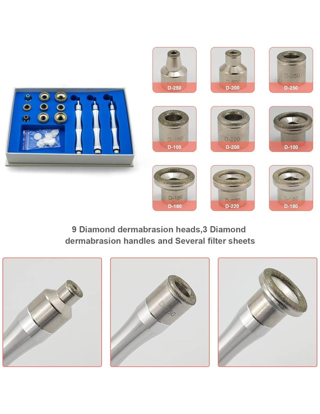 - Hidrodermoabrasión: Con puntas de micro diamante instaladas con el dispositivo de peeling de agua, juntos pueden hacer el peeling de la piel sin humedad en la piel al mismo tiempo, utiliza agua destilada o solución salina para enjuagar profundamente la suciedad.