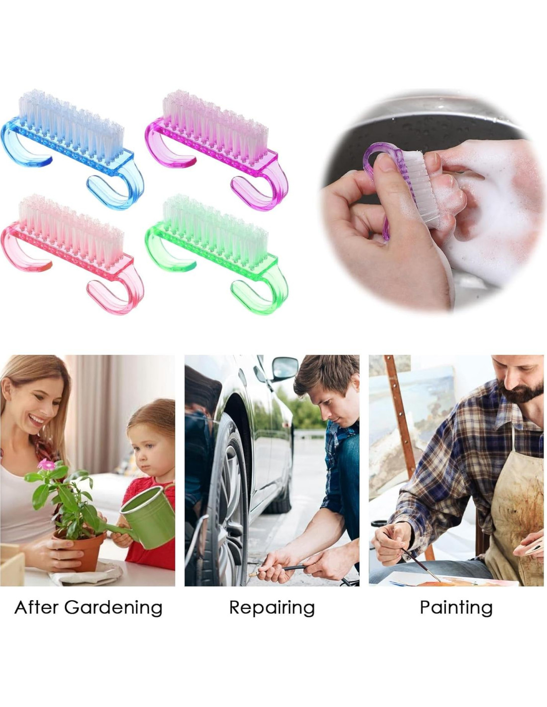 - Cepillo de Uñas Multifuncional: El cepillo de fregar uñas no solo es para el cuidado de uñas, herramientas de pedicura, exfoliador de pies, cepillo para dedos, sino que también puede limpiar la suciedad de las uñas de las mascotas, teclados, ranuras.