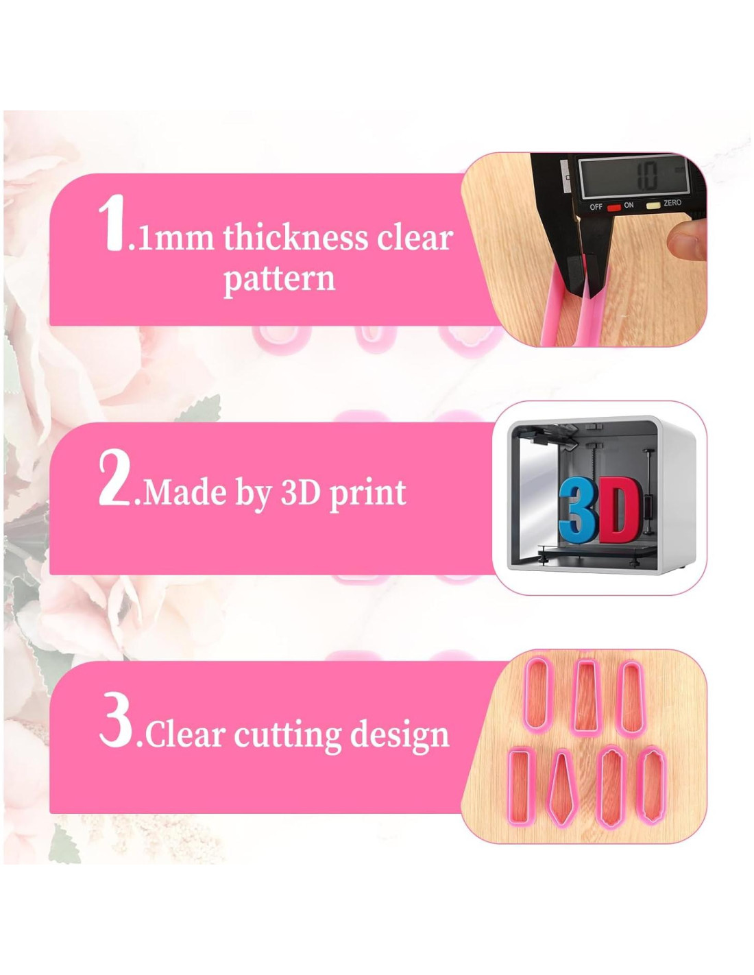 - Producción Exquisita: Diseñados con tecnología de impresión 3D, cada cortador de aretes tiene un diseño claro con un borde preciso de 0.4mm (+/-0.1mm), lo que puede brindar una experiencia de corte sin costuras y cómoda para tus proyectos de arcilla de polímero.