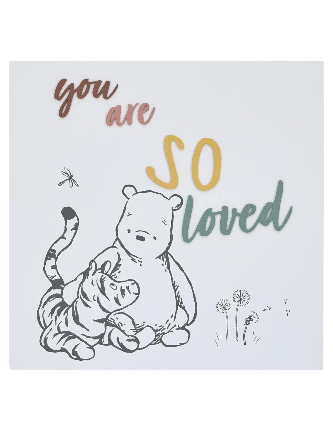 El clásico Winnie the Pooh y Tigger también son encantadores en esta decoración de pared de madera de Disney. Presenta a Pooh Bear y Tigger entre los dientes de león con letras en relieve que dicen 'eres muy querido' en suaves tonos de marfil y gris. Mide 35.56 cm x 35.56 cm y está hecho de madera natural. ¡Una divertida adición a cualquier guardería!