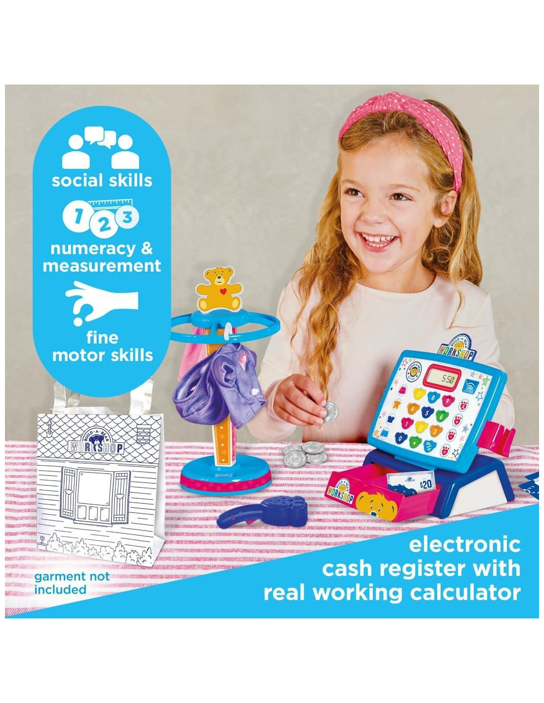 - INCLUYE: Caja registradora electrónica, escáner, soporte de exhibición de ropa, 3 perchas, dinero de juguete, tarjeta de crédito de juguete y bolsa de transporte de juguete. OSO Y ROPA NO INCLUIDOS.