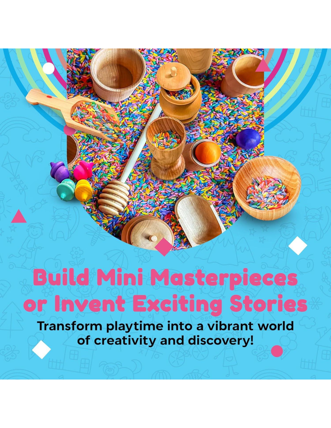 - Mejora las Habilidades Motoras y la Coordinación: Involucra las pequeñas manos con arroz arcoíris vibrante y herramientas de caja sensorial de madera que ayudan a promover habilidades motoras finas y coordinación mano-ojo. A los niños les encantará usar cucharas y herramientas de caja sensorial que fortalecen habilidades de desarrollo esenciales de manera lúdica y atractiva.