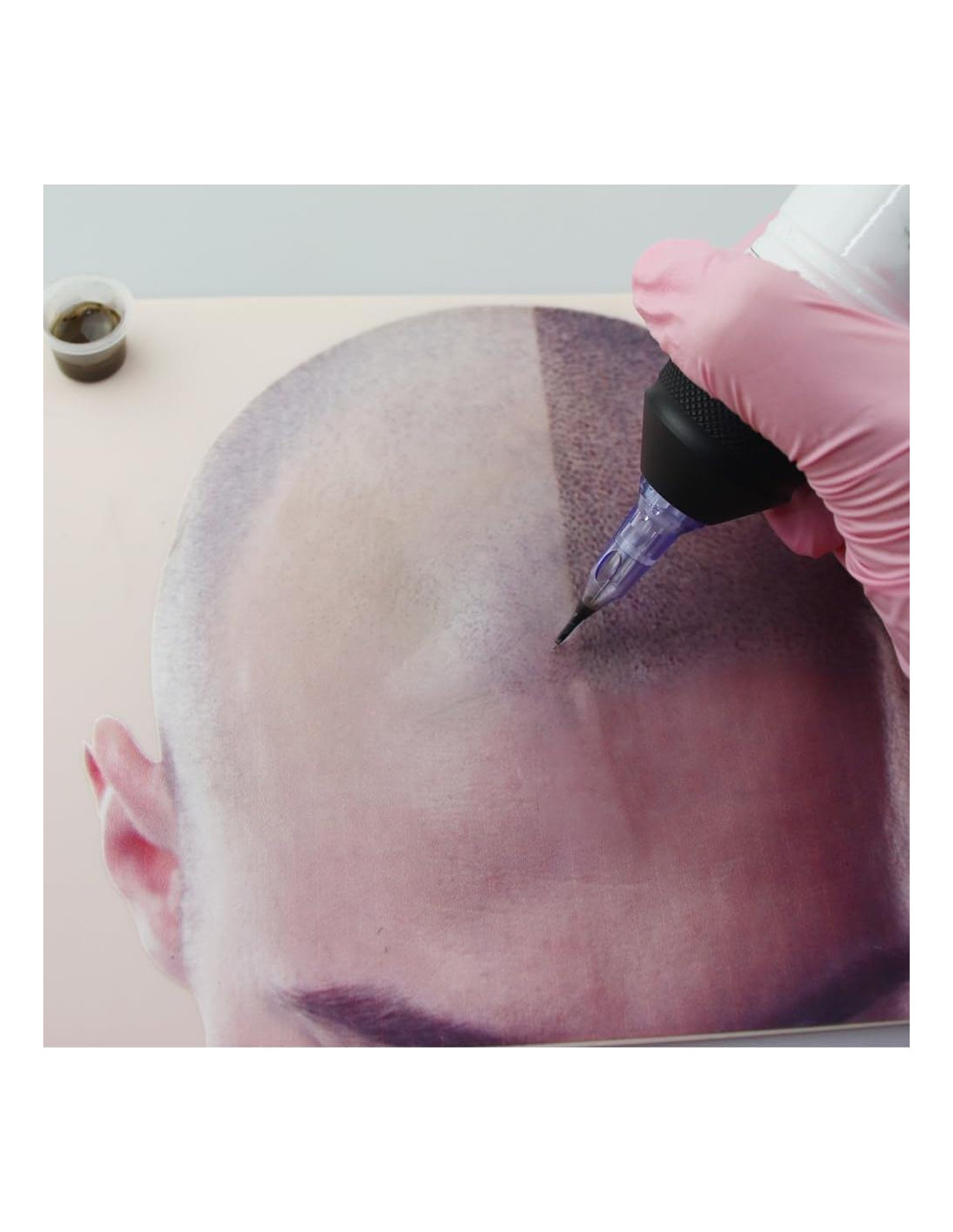 - Piel de Práctica de Micropigmentación del Cuero Cabelludo Comparación Antes y Después: Un lado de la piel de práctica presenta una imagen real de un cuero cabelludo antes y después del tatuaje capilar, permitiendo a los aprendices evaluar su progreso y mejora con cada sesión.