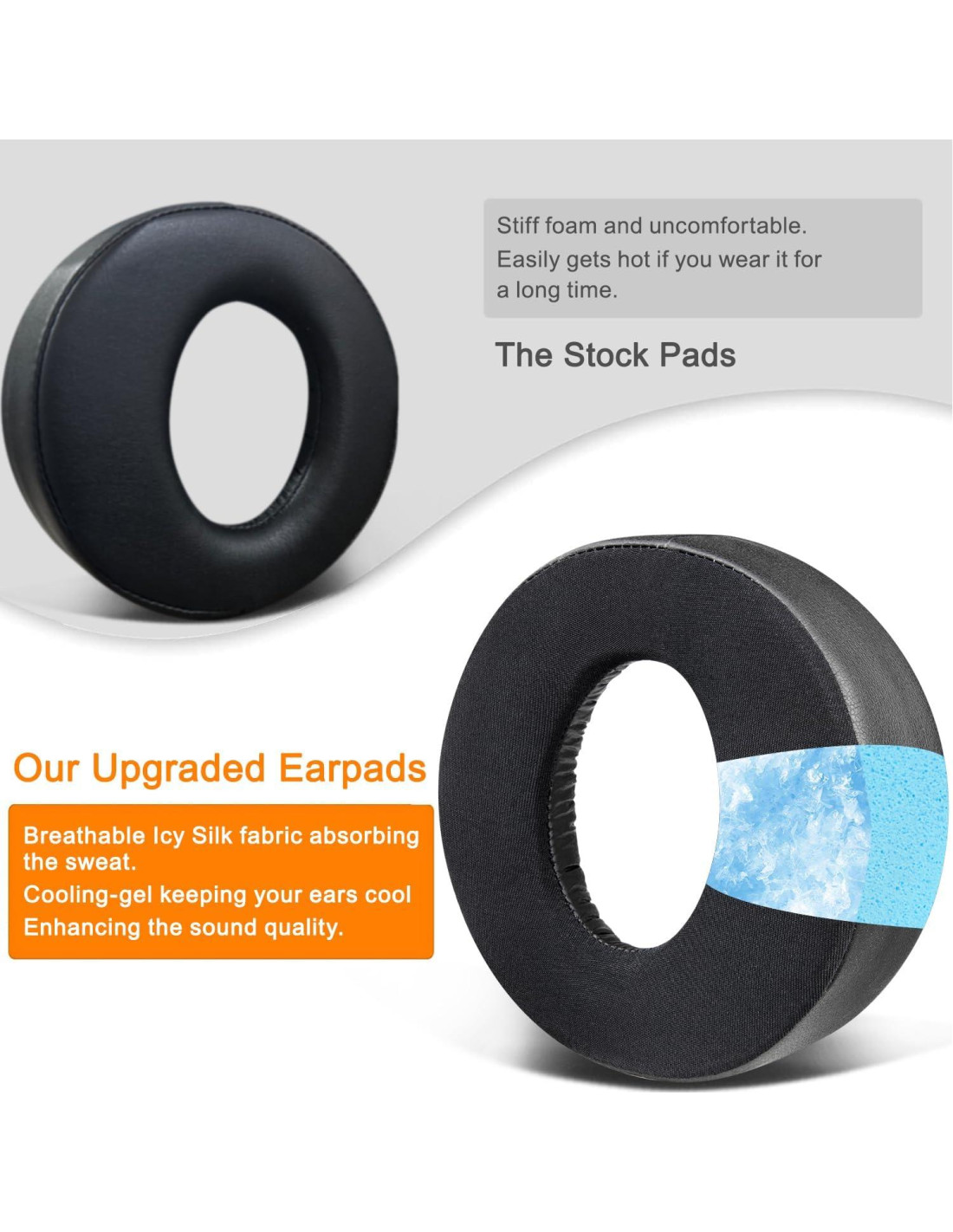 - Mantén tus oídos frescos: El suave gel refrigerante se añade bajo la capa superior de tela (tela de seda helada transpirable) de las almohadillas, absorbiendo el sudor en los días de verano y manteniendo tus oídos frescos después de un largo tiempo de uso.