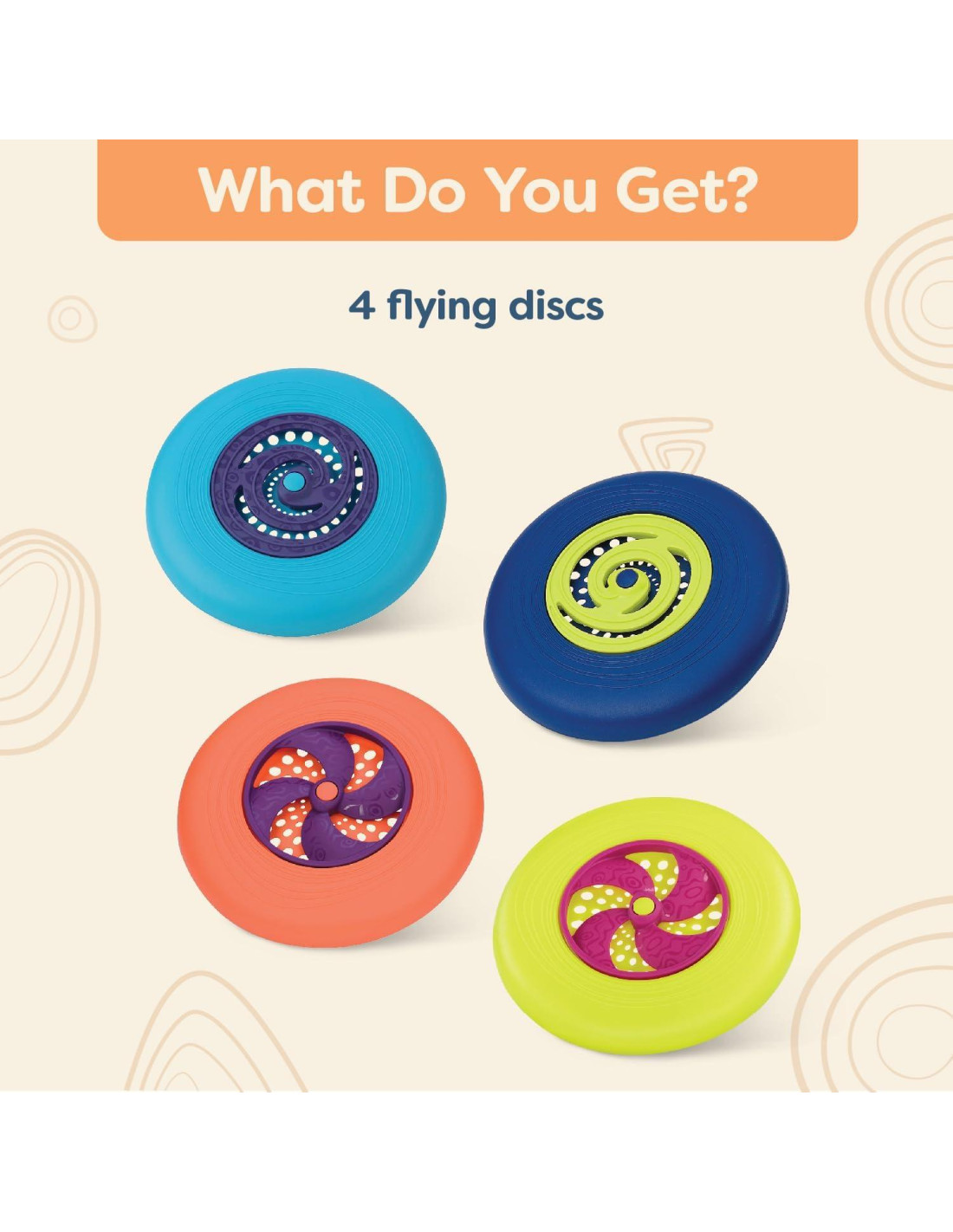 Gira, Lanza y Juega - Set de 4 Discos Voladores para Niños Desliza estos discos coloridos por el aire y observa cómo el centro giratorio entra en acción. Cada disco volador en este vibrante set de 4 piezas presenta una combinación de colores única y un centro giratorio incorporado para diversión visual adicional. Ya sea que los estés lanzando por el jardín, girándolos en tu dedo o desafiando a amigos a lanzamientos de larga distancia, estos juguetes voladores ligeros ofrecen horas de juego activo al aire libre. Perfectos para el patio, parque, playa o al borde de la piscina, estos discos voladores suaves y seguros fomentan correr, saltar, atrapar y lanzar, aumentando la actividad física mientras los niños disfrutan del sol. Diseñados para promover la coordinación mano-ojo, agilidad y habilidades motoras, estos discos son una forma divertida y efectiva de apoyar un desarrollo saludable. Hecho con cuidado por B. Toys, este set viene en un empaque 100% reciclable para familias ecológicas. Genial para edades de 4 años en adelante.