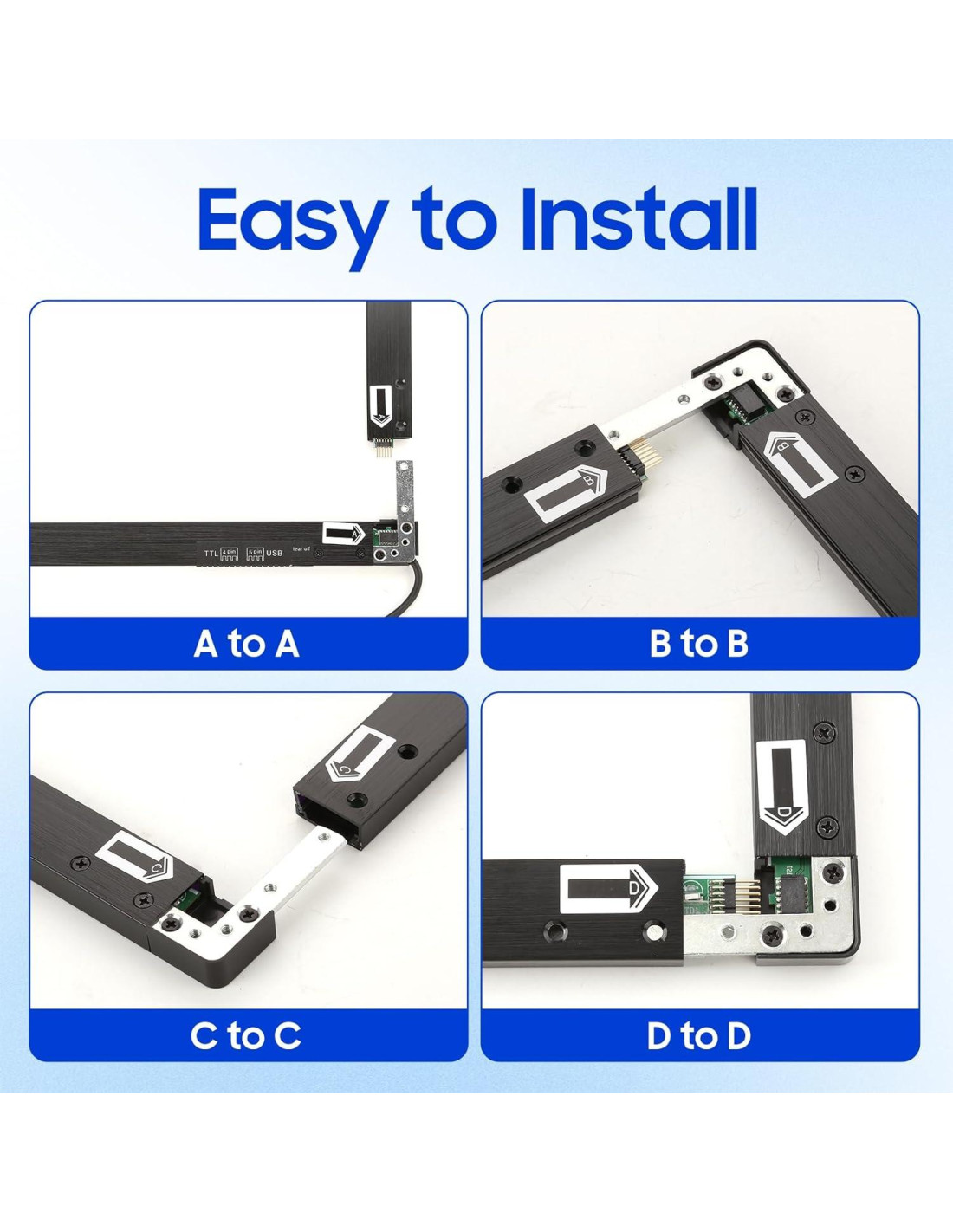 - [Instalación Simple y Eficiente] Este marco táctil infrarrojo adopta un diseño innovador de plugin, haciendo que la instalación sea fácil. Los usuarios no necesitan herramientas complejas ni habilidades profesionales, solo seguir pasos simples para instalar la superposición de pantalla táctil infrarroja A-A, B-B, C-C, D-D y pegarlas en el monitor. Este diseño no solo ahorra tiempo de instalación, sino que también reduce la dificultad de instalación, incluso cuando se usa por primera vez sin ninguna dificultad.
