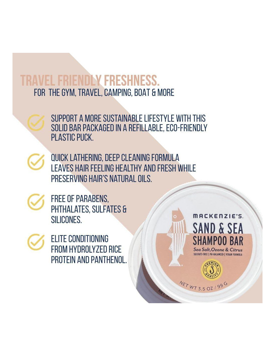 - FRESCURA AMIGABLE PARA VIAJES: Cuando se trata de la vida en movimiento, nada supera los Jabones Sólidos de Champú de MacKenzie para una frescura amigable para viajes. Ahora disponible en el aroma a sal marina, ozono y cítricos del Jabón Sólido de Champú Sand & Sea de MacKenzie.