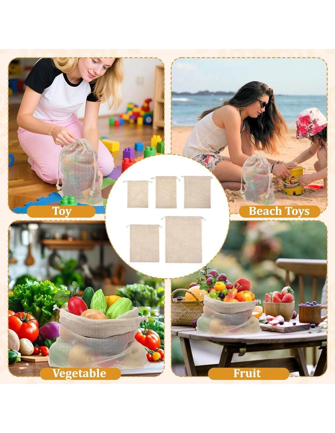- Almacenamiento Versátil Más allá de frutas y verduras, estas bolsas para el mercado de agricultores son perfectas para organizar nueces, granos, juguetes o elementos esenciales de viaje. El diseño transpirable mantiene los productos frescos por más tiempo, mientras que el cierre con cordón asegura los artículos durante el transporte. Úselas para mercados de agricultores, picnics o almacenamiento en el refrigerador, estas bolsas se adaptan a cualquier estilo de vida.