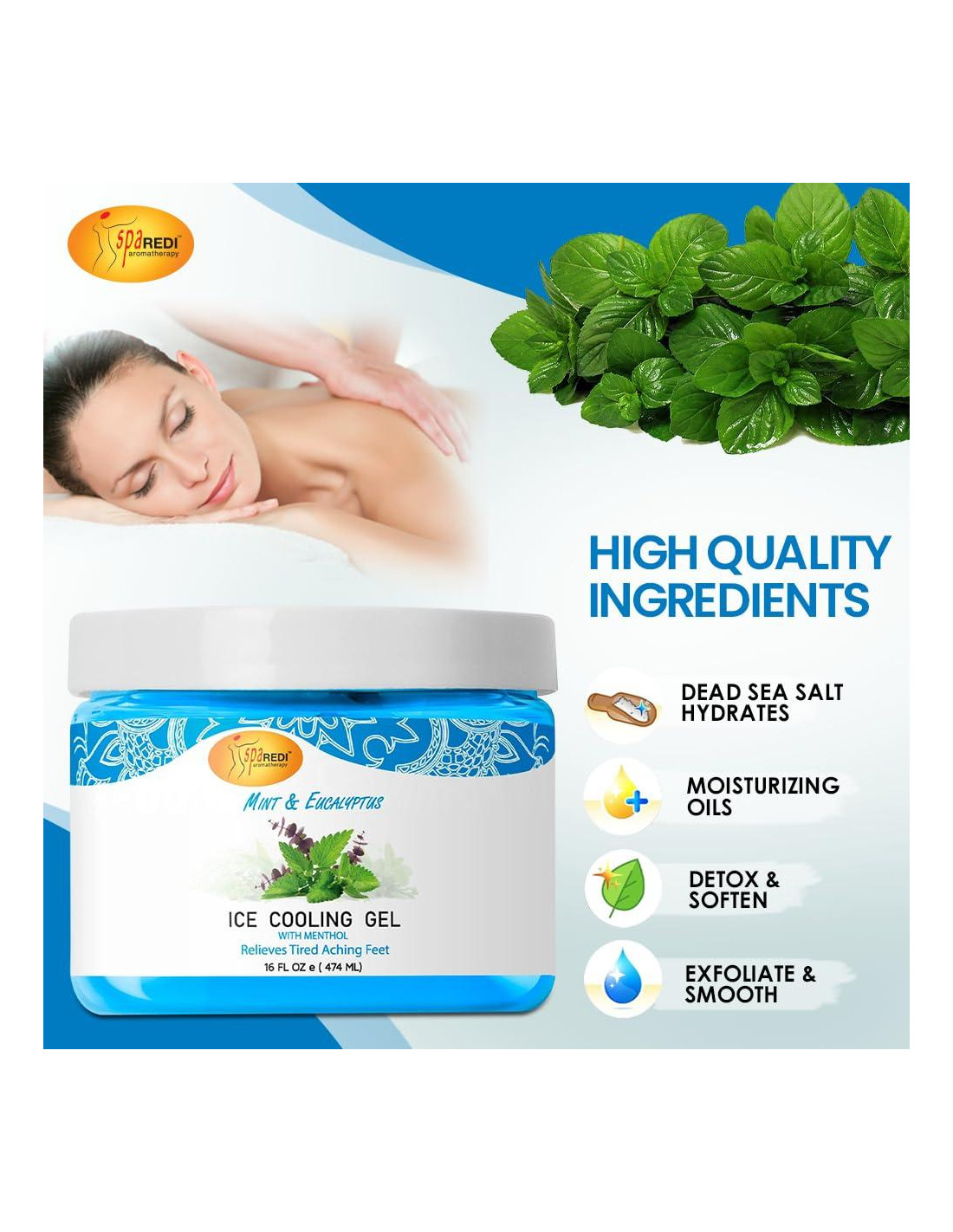 - Spa Redi- Gel de Enfriamiento está hecho Sin: Nuestro producto es Libre de Sulfatos, Libre de Silicona y Libre de Crueldad. Nunca probamos en animales.