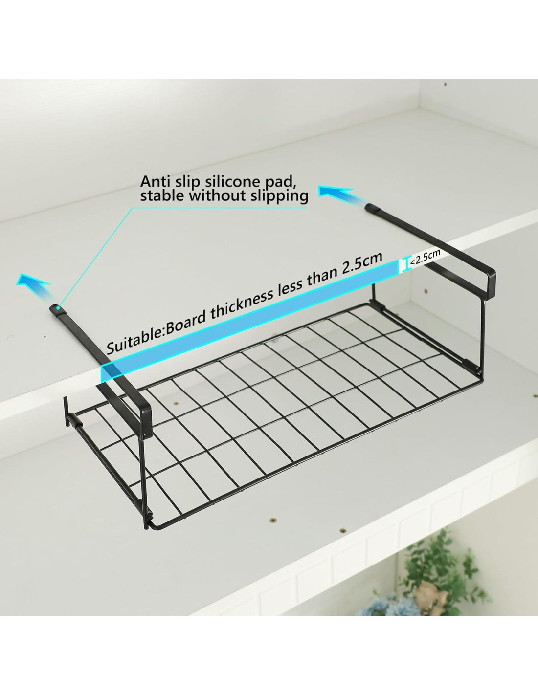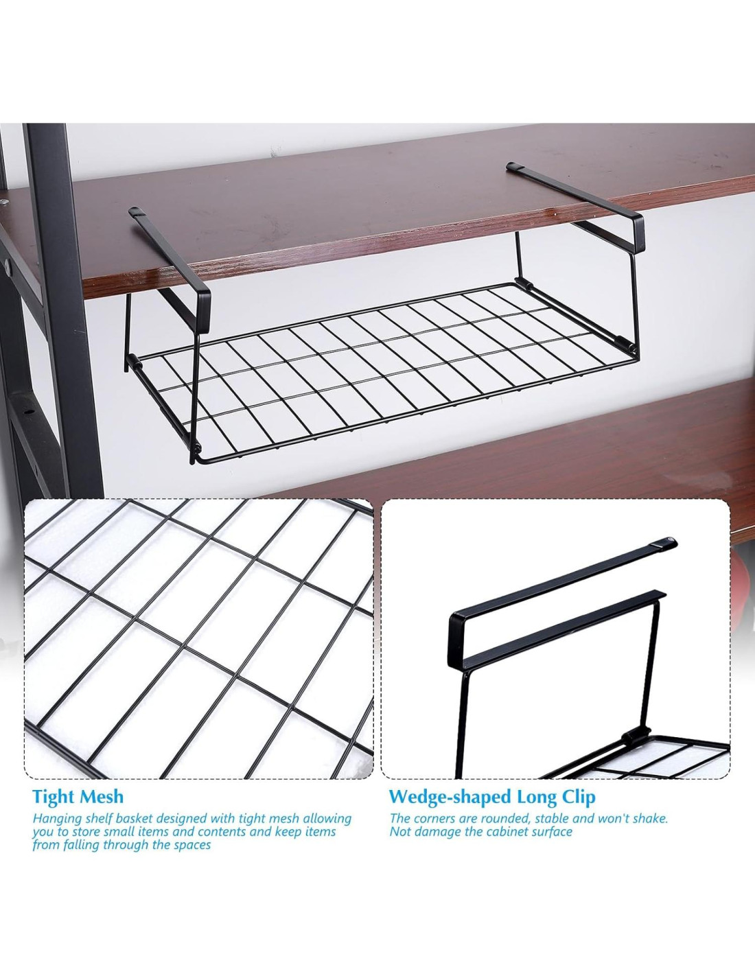 - Fácil de instalar: si el grosor del estante es más delgado que el brazo del estante bajo escritorio, simplemente desliza el organizador de canasta en el estante, no necesitas perforar agujeros en la pared