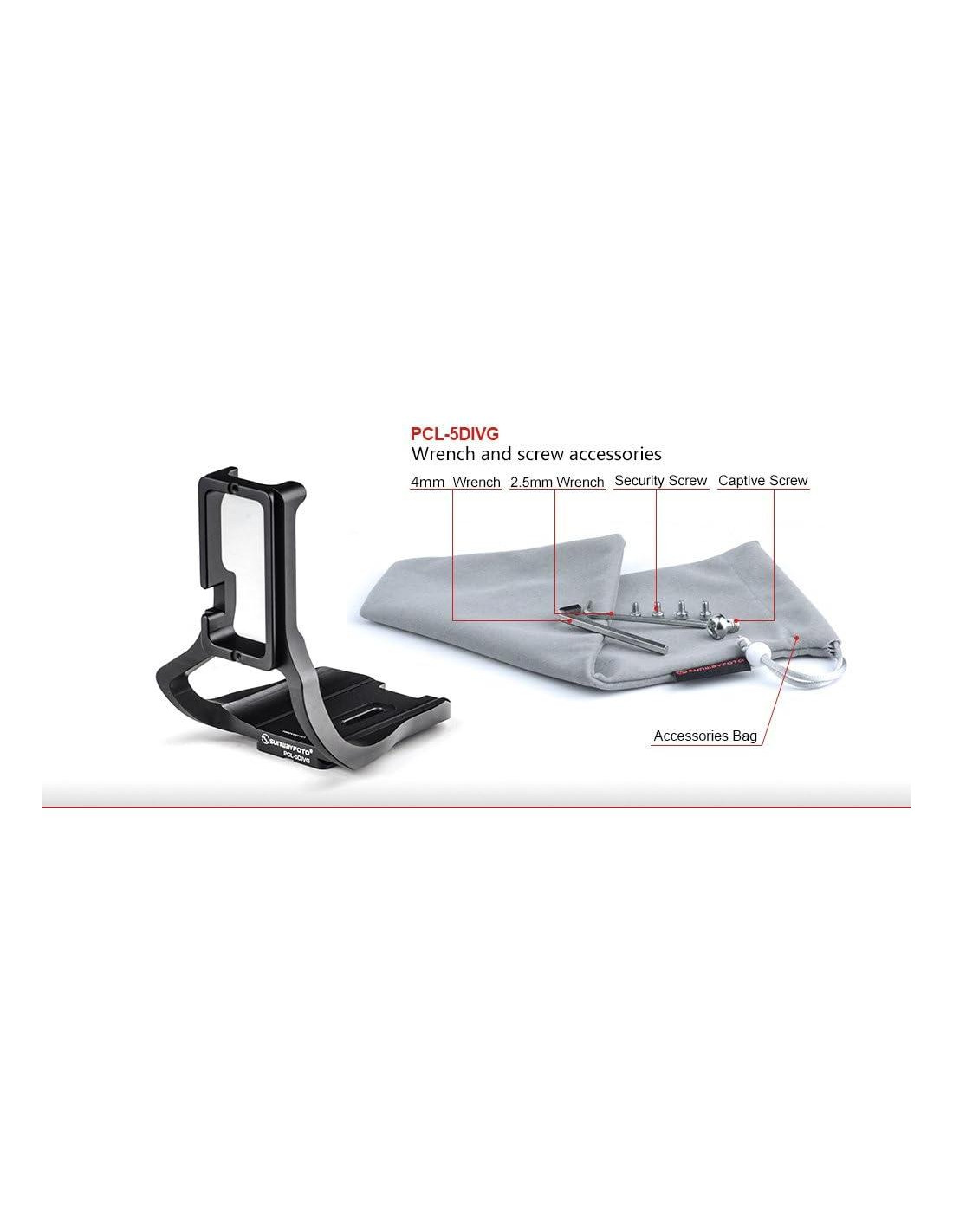 Placa en L PCL-5DIVG compatible con Arca de la marca SUNWAYFOTO para la Cámara Canon 5D Mark IV con Grip de Batería. Fabricada con precisión mediante CNC a partir de aluminio de grado aeronáutico sólido. Tornillo de montaje: 1/4-20 Dovetail Ancho: 39mm Ancho Superior: 85mm Peso: 162g (0.162kg). Longitud 125mm Altura 134mm Fabricada específicamente para la Canon 5D Mark IV con Grip instalado Características del Producto: 1. Fabricada con precisión a partir de aluminio de grado aeronáutico. 2. Anodizado de alta calidad en la superficie, sólido y duradero. 3. Bisel convexo que previene el movimiento. 4. Soporte para correa. 5. Incluye 4 tornillos de parada de seguridad, 1 tornillo de 1/4" y 2 llaves allen.