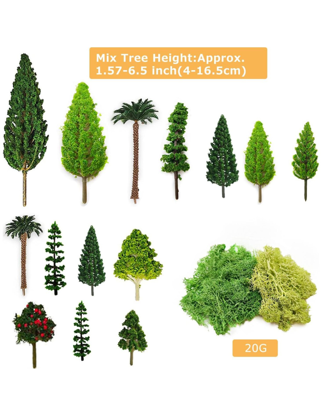 - 32 Pcs Accesorios para Mini Jardín: Los accesorios para mini jardín contienen 14 piezas de árboles en miniatura de 1.57-6.5 pulgadas (4-16.5 cm), 1 x tienda, 1 x fogata, 3 x nutrias pequeñas, 1 x ciervo, 1 x oso, 1 x banco, 1 x plátano, 1 x anillo de natación, 1 canoa con 2 remos, 1 pozo con 1 cubo, una hoja tropical y 2 bolsas de musgo verde de aproximadamente 20g en total, proporcionando un mundo creativo y de ensueño para adultos o niños que aman hacer jardines en miniatura