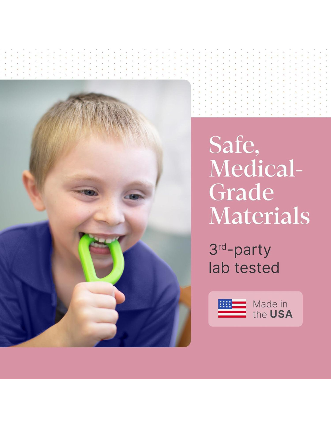 - MATERIALES SEGUROS PARA NIÑOS: Hecho en los EE. UU. con materiales de grado médico y probado por terceros en laboratorios acreditados, nuestros juguetes masticables sensoriales ofrecen una alternativa segura a masticar o morder uñas, dedos, nudillos, camisetas, lápices y más. Combo de 2 piezas