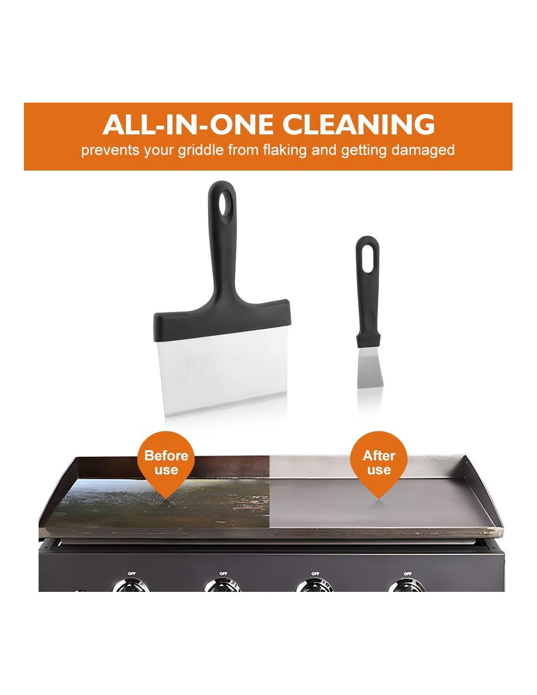 - [GRADO PESADO] El raspador está hecho de acero inoxidable, con alta dureza, fuerte limpieza y fácil eliminación de suciedad. La amplia hoja de acero inoxidable permite que se use como un segundo raspador, moviendo alimentos de la superficie de cocción a la bandeja, lo que facilita raspar la suciedad sin lastimarte las manos accidentalmente.