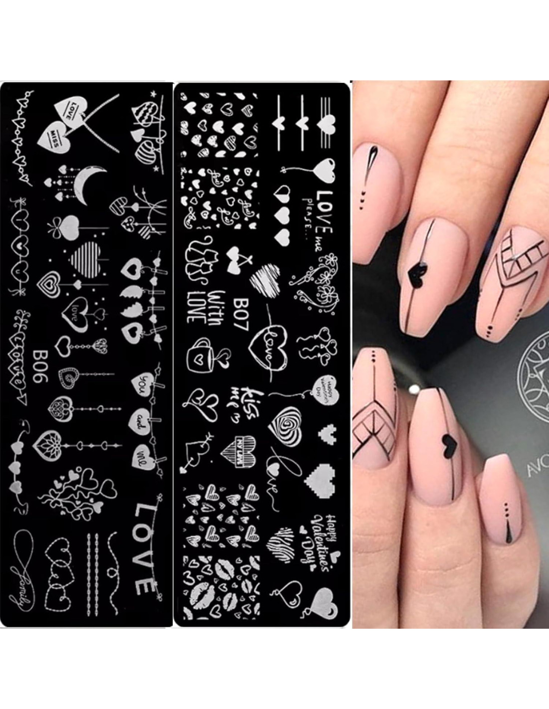 - Diseño de Corazón: 6 piezas de plantillas de estampado de arte de uñas están llenas de elementos románticos, con patrones de corazones, labios, letras, rosas, llaves, candados en forma de corazón, etc., muy adecuadas para que mujeres y niñas hagan sus propias uñas, prácticas y hermosas