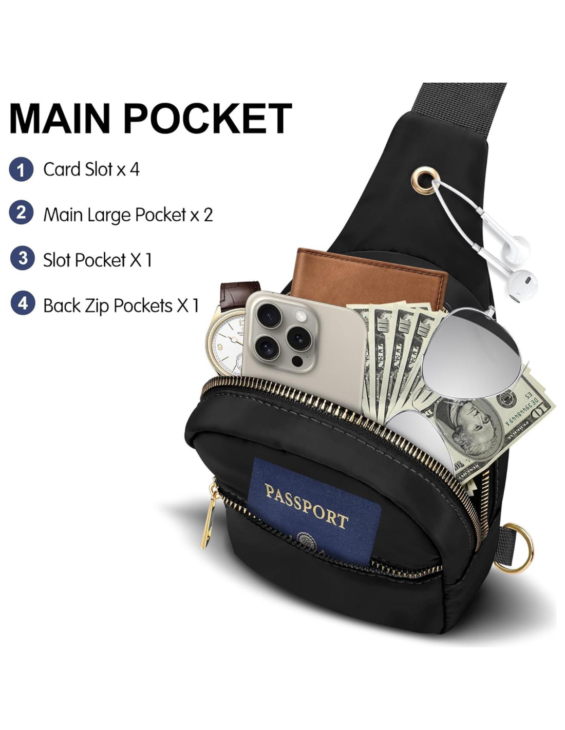 - Gran capacidad: Amplio bolsillo principal con dos cierres de cremallera que mantienen todos tus esenciales seguros y fáciles de poner y sacar.