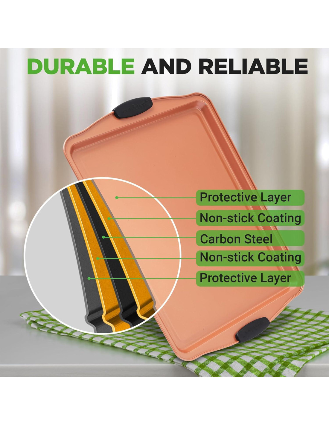 - DISEÑO APILABLE: El juego de horneado profesional reutilizable y antiadherente presenta un diseño de bandeja ancha apilable que ahorra espacio para un almacenamiento conveniente. Es totalmente compatible con hornos estándar y de convección. Apto para horno, refrigerador y congelador
