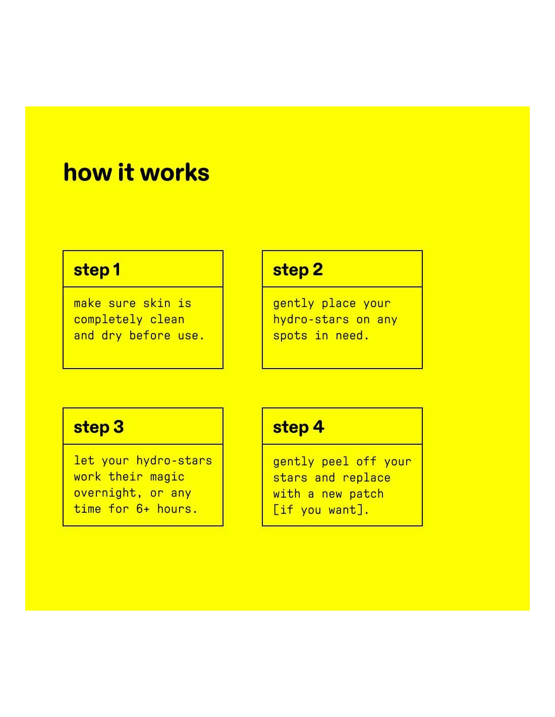 - A SINGLE INGREDIENT: Hydro-Stars solo tiene un ingrediente: hidrocoloide, una sustancia tomada de vendajes quirúrgicos que está clínicamente probada para mejorar la apariencia de las espinillas durante la noche.