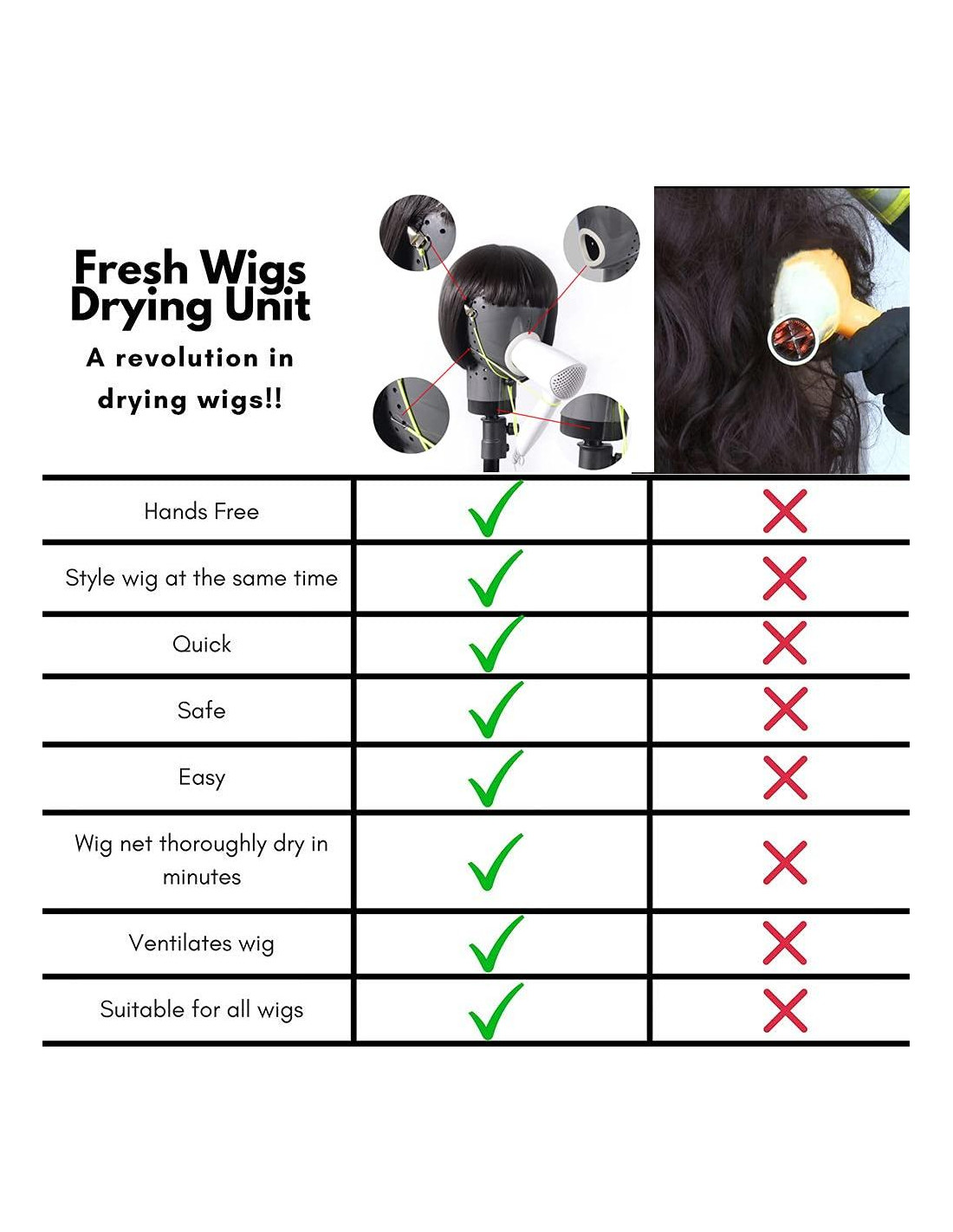 - Secado seguro de pelucas de cabello natural y sintético. Prolonga la vida de tu peluca y mantenla sintiéndose y oliendo limpia y fresca - Las pelucas son caras y debes tratarlas con cuidado. La unidad de secado de pelucas frescas no causa daño a tus pelucas al secarlas. Lava y seca tu peluca y manos libres - te permite peinar la peluca al mismo tiempo que se seca.
