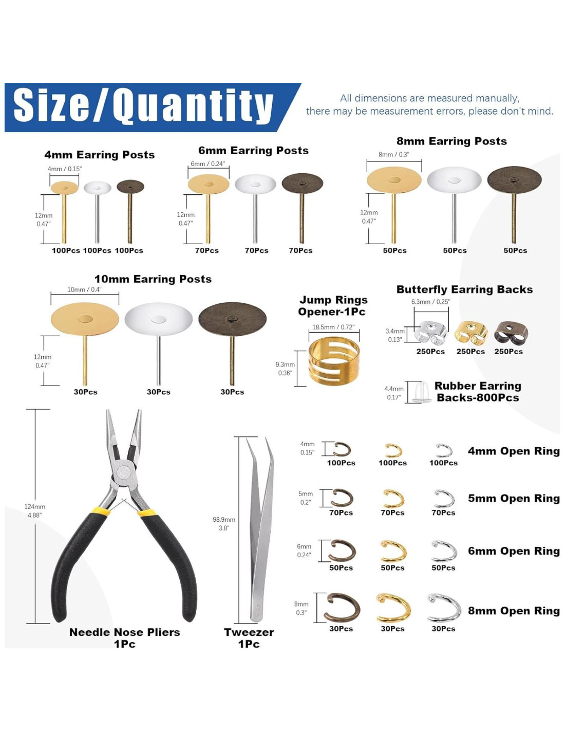 - Componentes incluidos: 750pcs puntos de arete, 750pcs respaldos de arete mariposa, 800pcs respaldos de arete de silicona, 750pcs anillas de salto abiertas, 1pc pinzas curvadas, 1pc abre anillas de salto, 1pc pinzas de punta de aguja