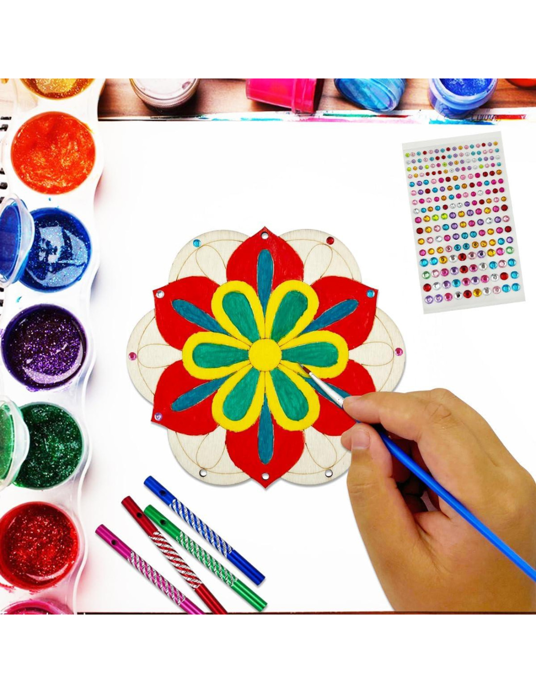 - El Kit de Campana de Viento Mandala Incluye: nuestro kit de campana de viento de madera mandala DIY incluye 24 piezas de madera (8 diseños, 3 piezas cada uno), 72x tubos de campana de viento (6 colores, 12 por cada color), 4x pinceles de pintura, 24x pintura (12 colores), 20M de alambre plateado, 24x cuerda de color, 1x pegatinas de rhinestone, suficiente para satisfacer tus necesidades diarias de uso y decoración.