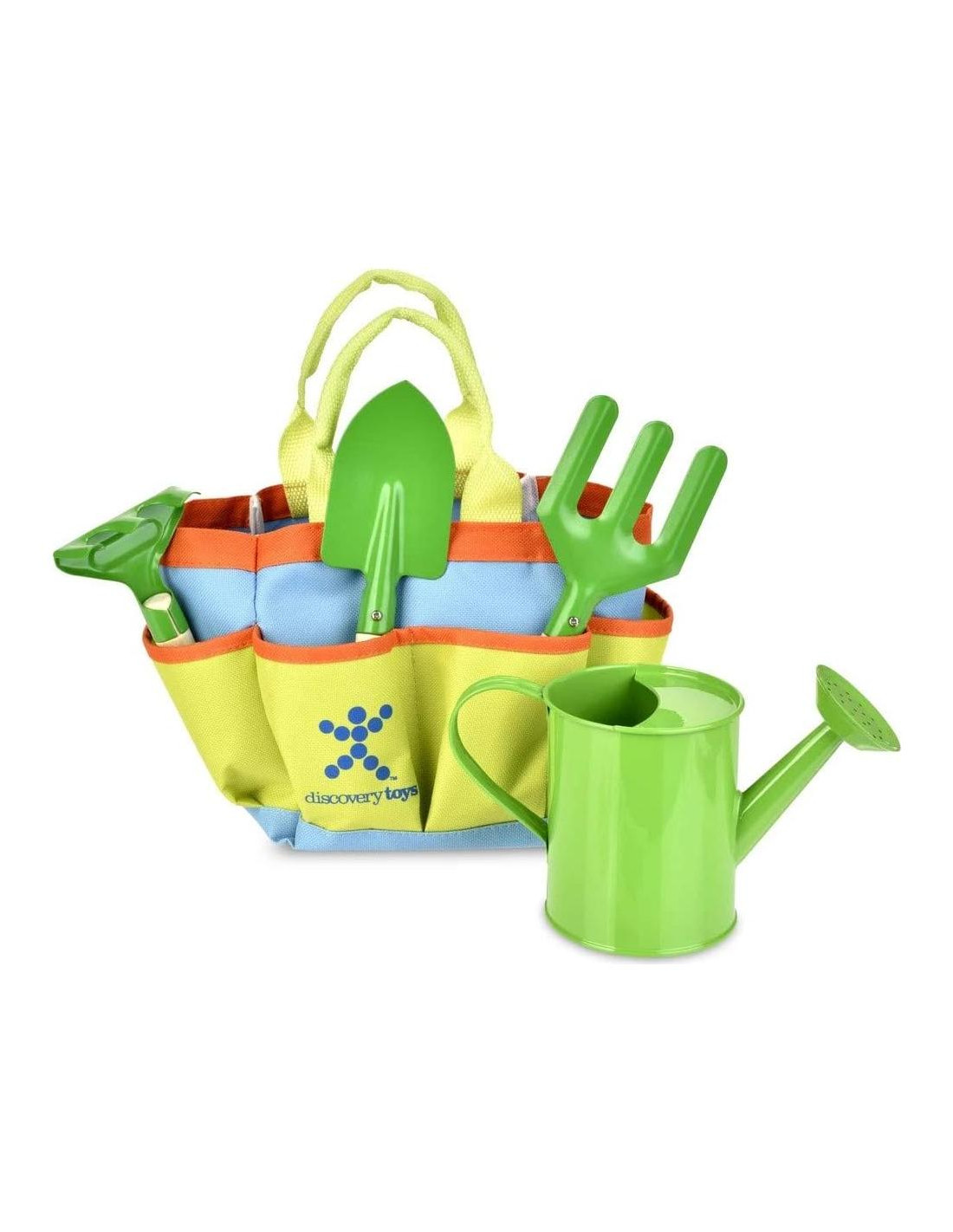 - El Juego de Bolsa de Jardín Junior de Discovery Toys es ligero, de tamaño conveniente y fácil de llevar. Incluye pala, horquilla, rastrillo y regadera de metal real de tamaño infantil. Las herramientas incluyen mangos de madera y extremos de metal.