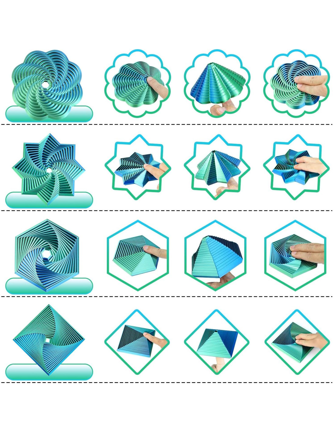 - Formas Geométricas Únicas: Incluye cuatro diseños llamativos: un hexágono, una estrella octagonal, una espiral en forma de flor y un cuadrado. Cada uno presenta patrones 3D vibrantes y de dos colores que crean un efecto visual hipnotizante, haciéndolos perfectos para la estimulación sensorial y la decoración de escritorio.