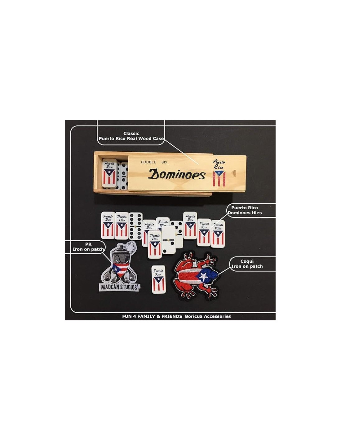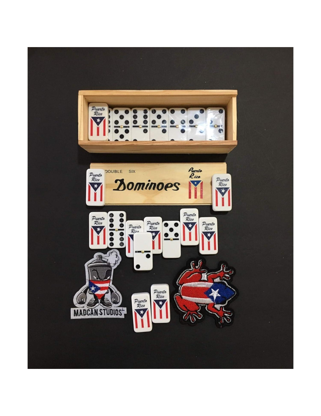 Dominó de Puerto Rico. Nuestro juego de dominó de Puerto Rico con banderas está pintado, no impreso. Para la familia, desde niños hasta adultos. Viene en la clásica caja de madera real con apertura deslizante. Un imprescindible para cada casa boricua. Hecho para durar y para momentos divertidos en familia y con amigos.