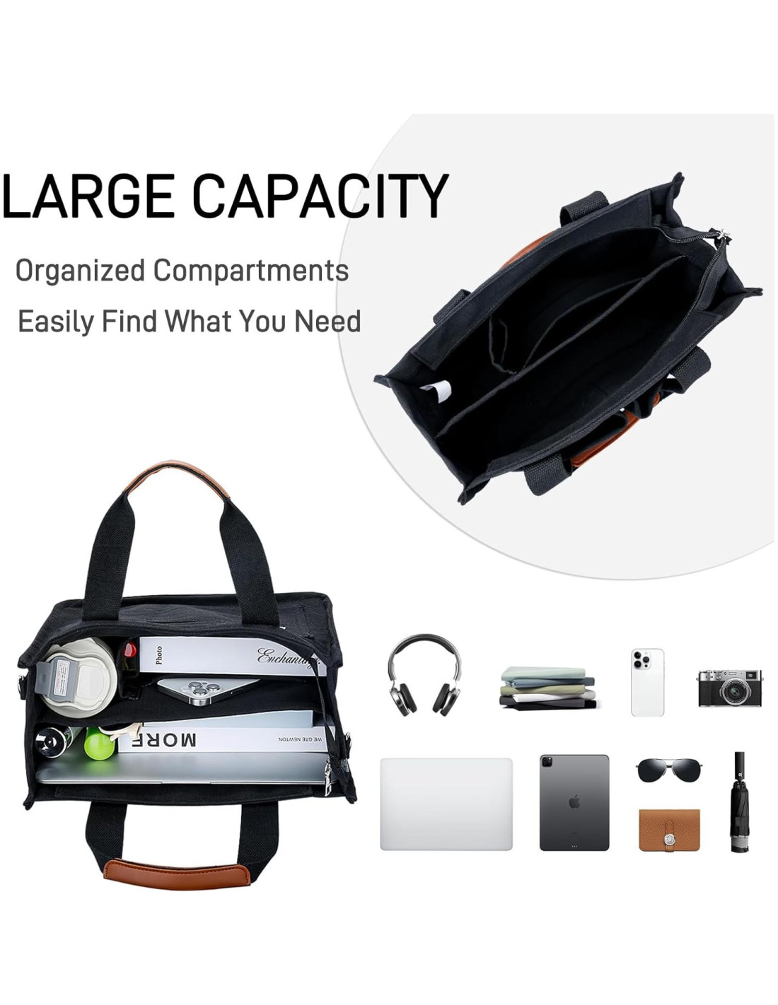- Tamaño Amplio con Bolsillos Organizacionales: Esta bolsa tote de lona grande proporciona mucho espacio para tus esenciales e incluye múltiples compartimentos para mantener todo organizado, ideal para el trabajo o la universidad