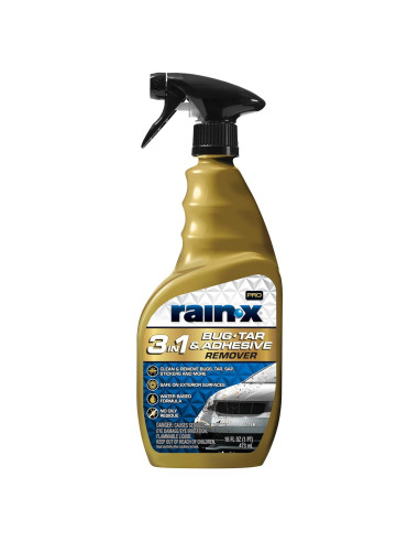 Rain-X Pro 620213 Removedor de Insectos, Alquitrán y Adhesivos 3 en 1 es un removedor premium de insectos, alquitrán y adhesivos con tecnología avanzada para ayudar a limpiar y eliminar contaminantes pegajosos y difíciles de limpiar. Limpia y elimina insectos, alquitrán/asfalto, excrementos de aves, savia de árboles, polvo de frenos, chicle, residuos y etiquetas. Es seguro de usar en todas las superficies exteriores y fácil de usar. Elimina todos los residuos adhesivos pegajosos sin causar daño ni dejar residuos grasos.