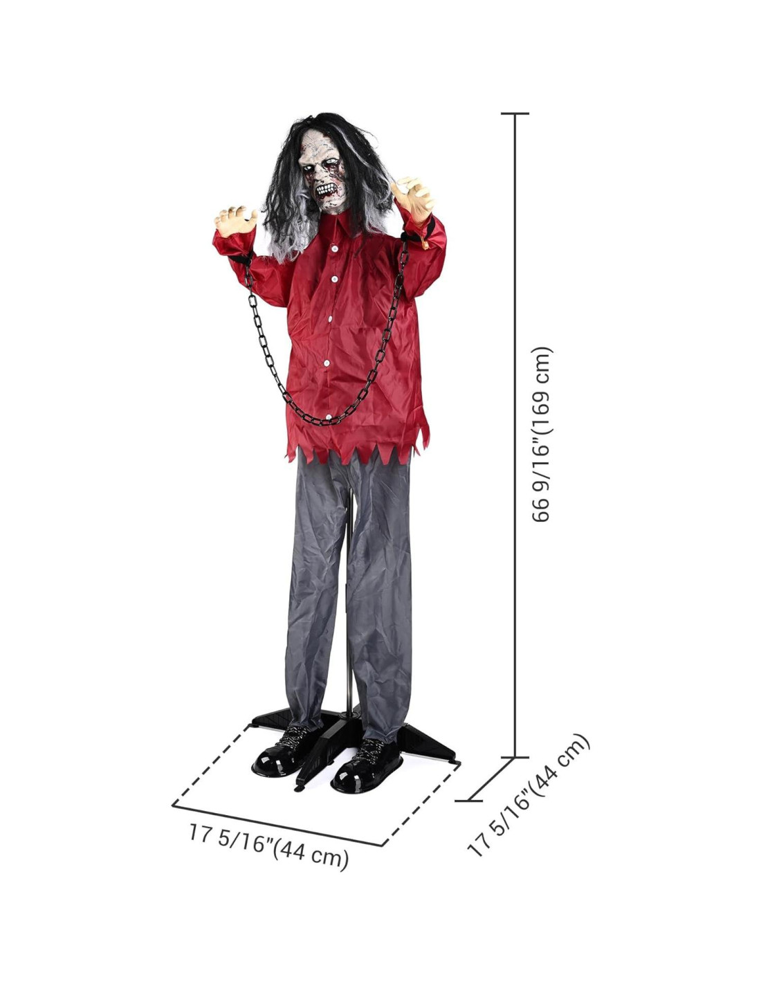 - Activado por Sonido y Tacto - Zombie Animatrónico de 5.7 Pies (1.73 m) de Pie está activado por sonido y tacto para balancearse hacia adelante y hacia atrás con sus ojos brillando con una luz roja espeluznante, y emitiendo un sonido de grito demoníaco escalofriante para aterrorizar a los niños que piden dulces, gran prop de Halloween para crear una escena horrible y una atmósfera espeluznante