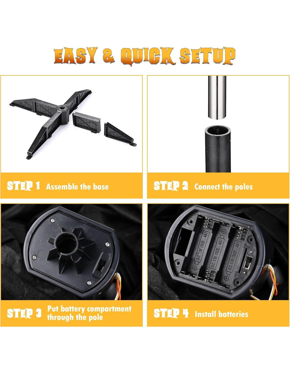 - Instalación Fácil y Rápida - No se requieren herramientas para una instalación fácil en minutos, solo ensambla la base, conecta los postes, coloca el compartimento de baterías a través del poste y extiende la decoración de fantasma; Presenta altura de poste ajustable al unir diferentes números de postes para adaptarse a tus necesidades, y base de 4 patas para mejor estabilidad