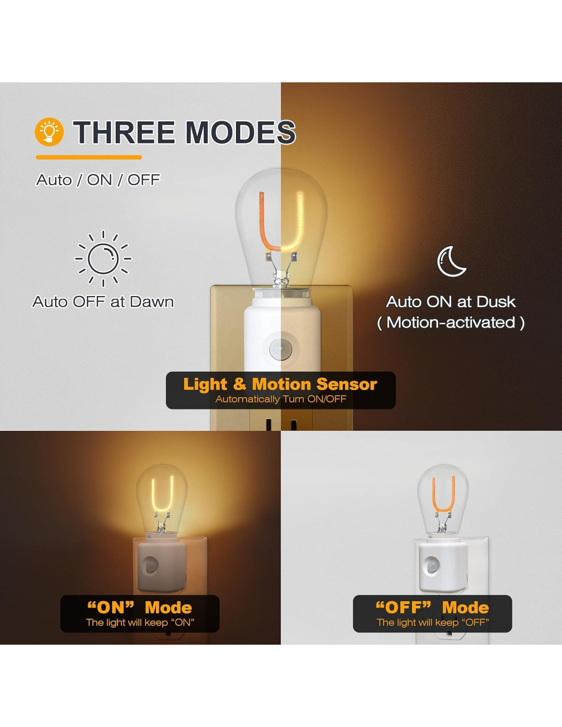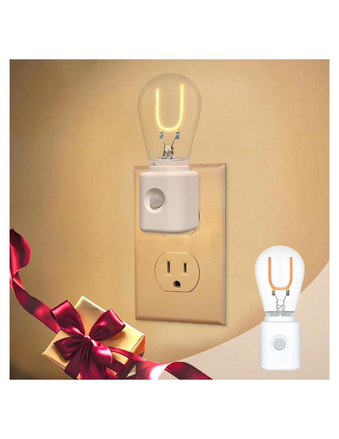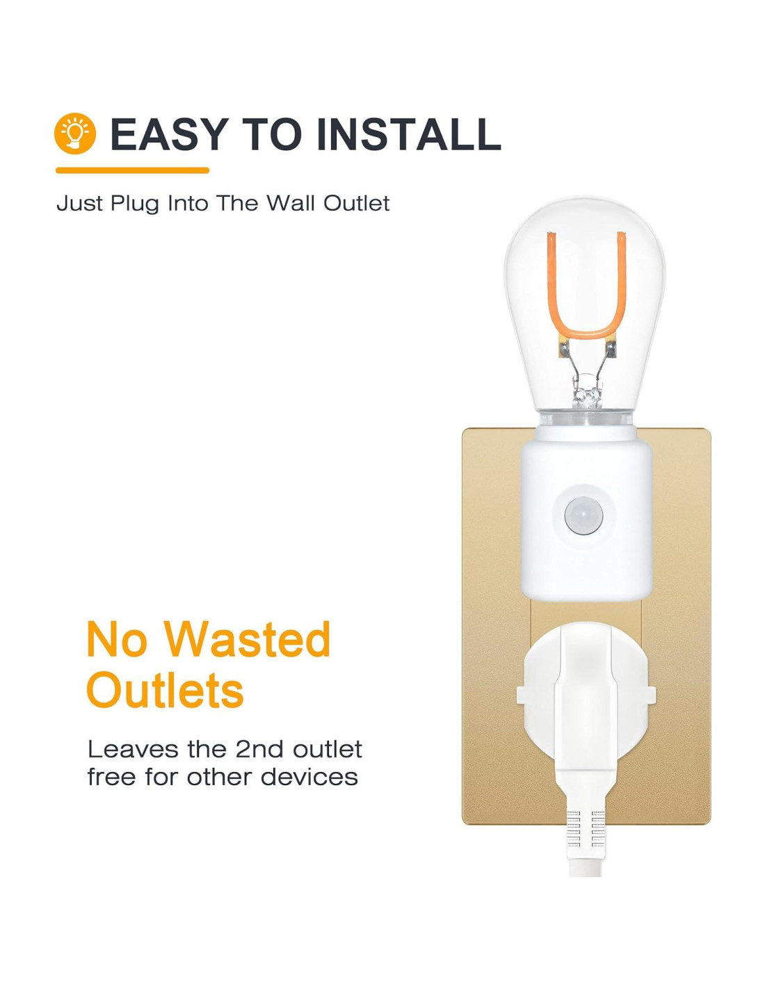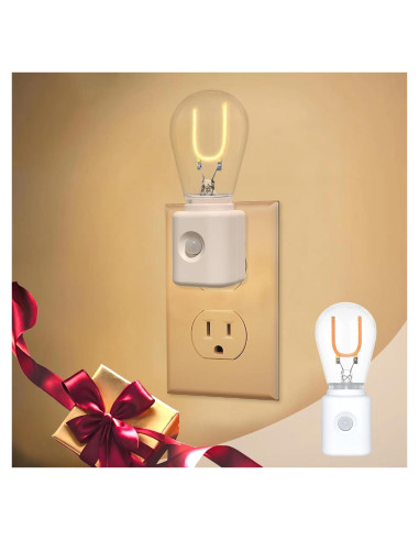 Decora tu hogar y disfruta de nuestra Luz Nocturna con Sensor de Movimiento LED Enchufable para crear un ambiente acogedor y una iluminación conveniente para cualquier habitación. Esta luz con sensor de movimiento se activa dentro de un rango de 3 metros (10 pies) y se apaga automáticamente después de 90 segundos sin movimiento. La luz de color cálido antiguo con brillo ajustable satisfará tus diferentes necesidades. La Luz Nocturna LED con Sensor de Movimiento compacta se enchufa en cualquier toma de corriente estándar y deja una segunda toma disponible para su uso. Perfecta para cualquier habitación de la casa: dormitorio, baño, cocina, pasillo, lavandería, estudio, dormitorio universitario, apartamento, casa rodante.