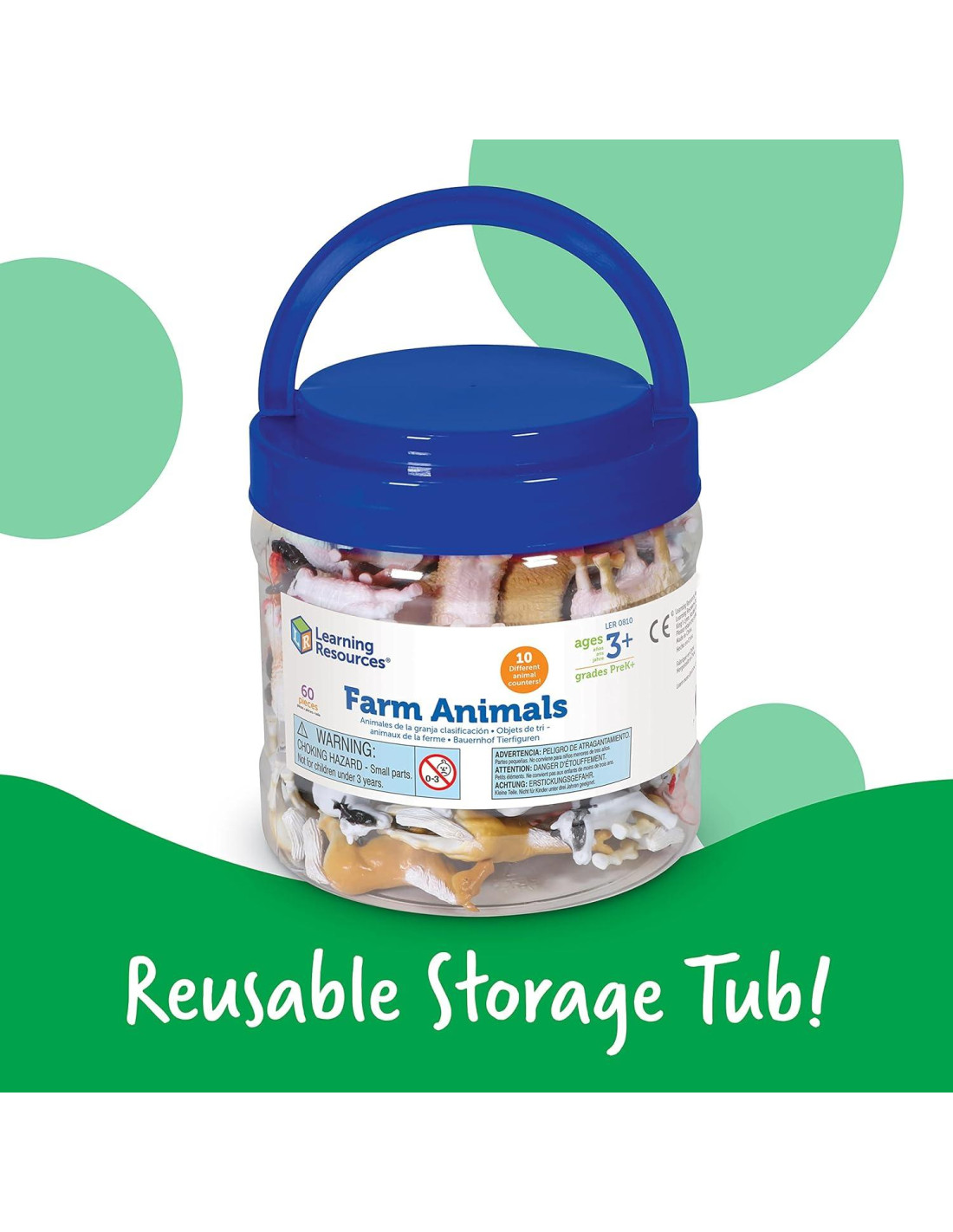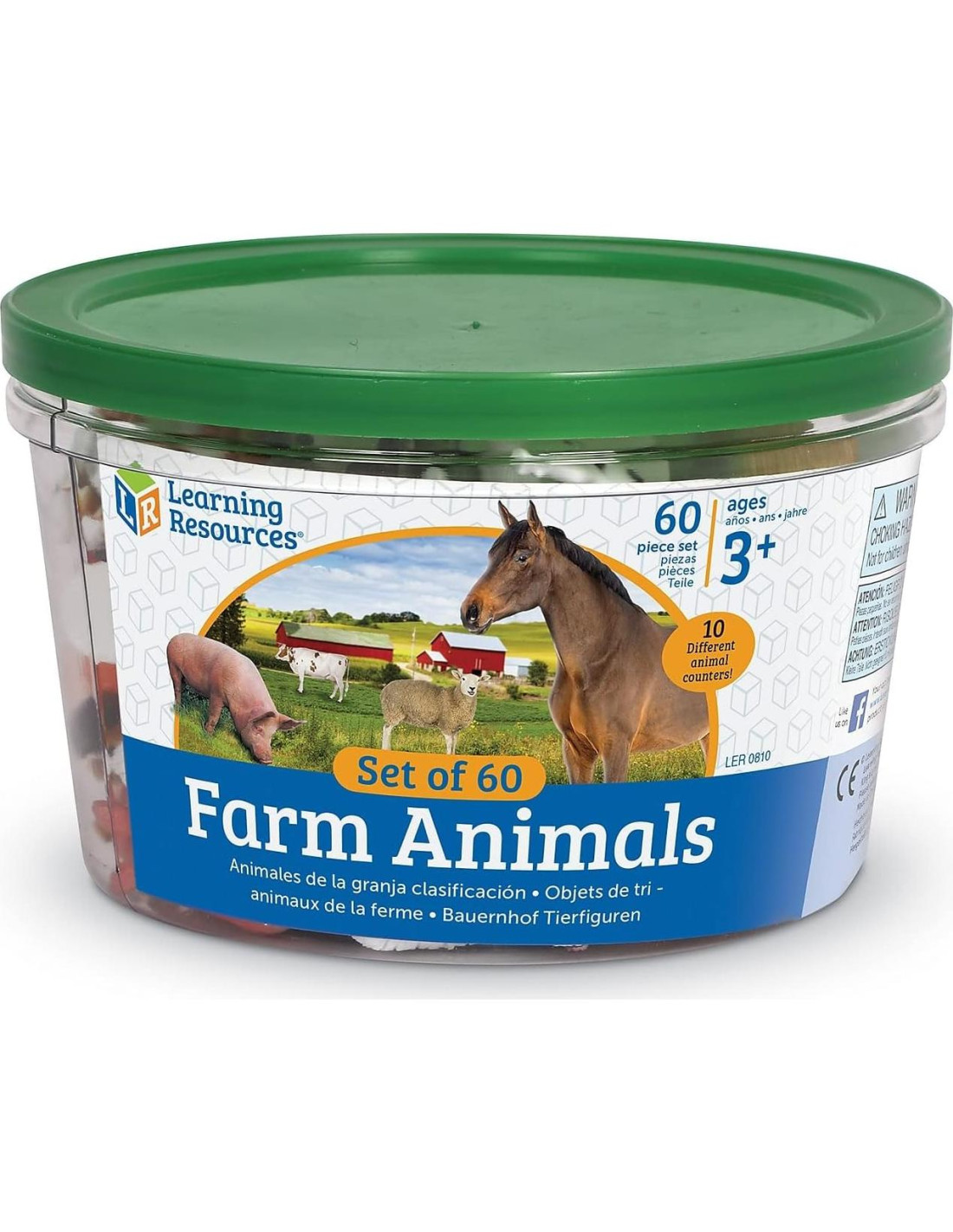 Los niños tan jóvenes como 3 años pueden desarrollar sus habilidades básicas de conteo, clasificación y patrones repetidos con estos divertidos animales de granja. Estos manipulativos matemáticos son una excelente manera de mantener a los pequeños aprendices comprometidos y motivados. Ellos pensarán que están jugando a hacer creer... ¡tú sabrás que están aprendiendo! Los contadores se pueden combinar con otros conjuntos de contadores para posibilidades de juego infinitas. La figura más grande (caballo) mide 2 pulgadas x 2 pulgadas (5,08 cm x 5,08 cm). ¡Incluye 60 animales y un conveniente balde de almacenamiento! Para edades de 3 años en adelante.