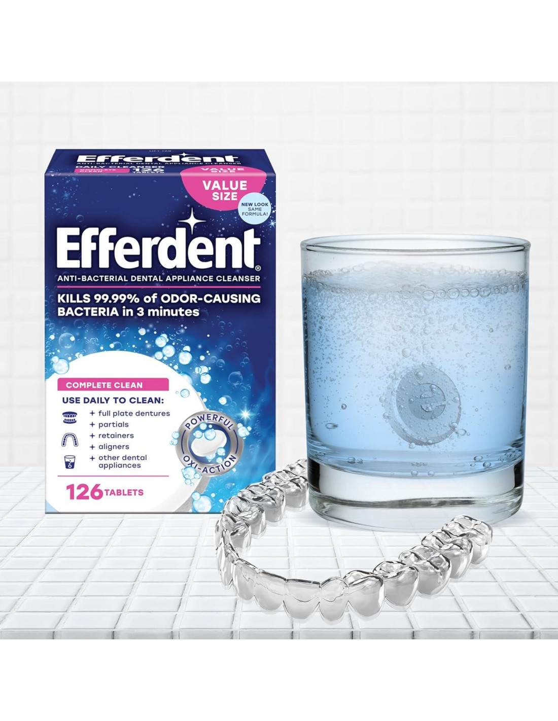- SET COMPLETO: El paquete de valor incluye 126 potentes tabletas de limpieza y un cepillo de dentadura premium con cerdas de doble cara para una limpieza exhaustiva
