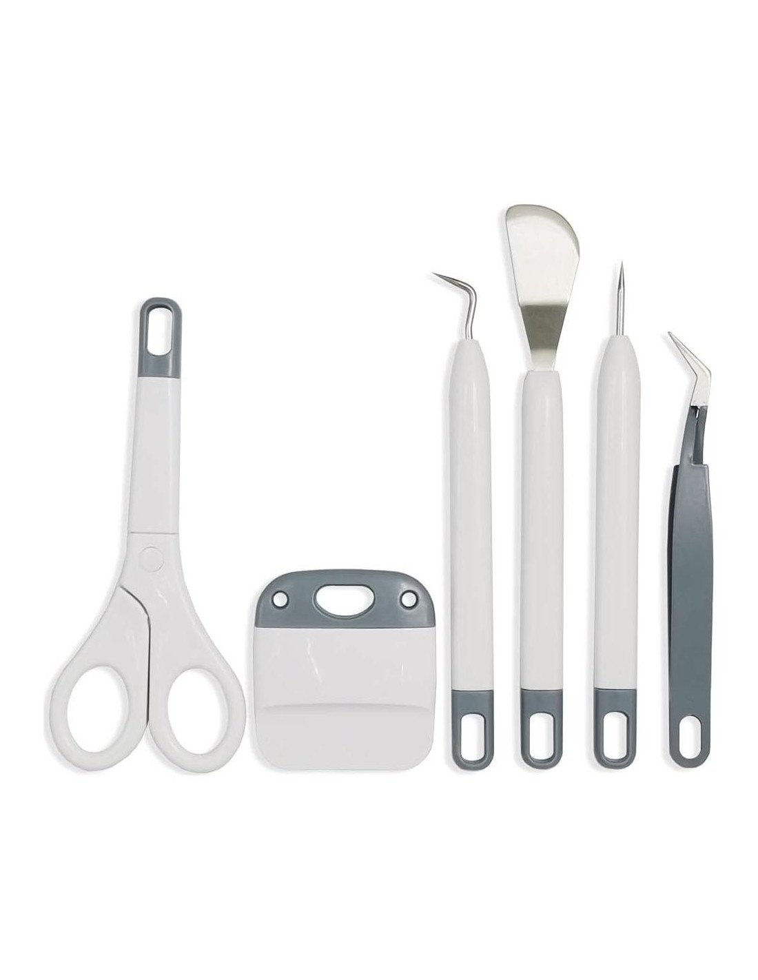 - Juego de herramientas de vinilo gris de 6 piezas: deshierbador, pinzas de agarre inverso, tijeras, espátula, raspador y deshierbador de gancho.