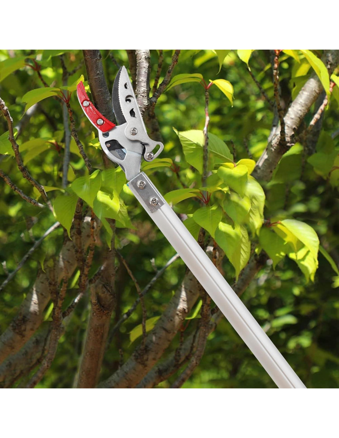 - [Cortador de Árbol de Mango Largo de 4.2 PIES] Con un robusto poste de aluminio, este cortador de mango largo extiende tu alcance a 51 pulgadas (129.54 cm), permitiéndote recortar arbustos y árboles altos de manera segura desde el suelo. Ideal como recortadora de árboles de largo alcance o tijeras de poda de largo alcance para jardinería, sin más necesidad de doblarse o esforzarse.