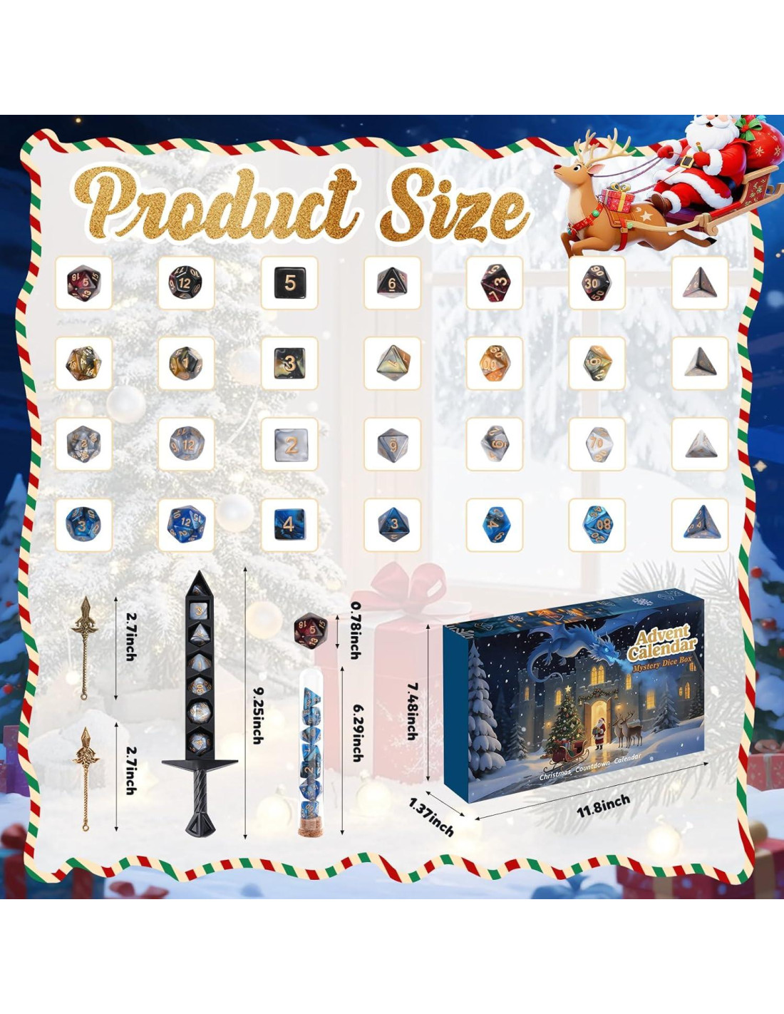 - Emocionante Cuenta Regresiva Navideña: Usa nuestro calendario de adviento de dados con accesorios DND únicos para crear una atmósfera festiva. Cada día trae una nueva sorpresa, culminando en una colección completa el día antes de Navidad.