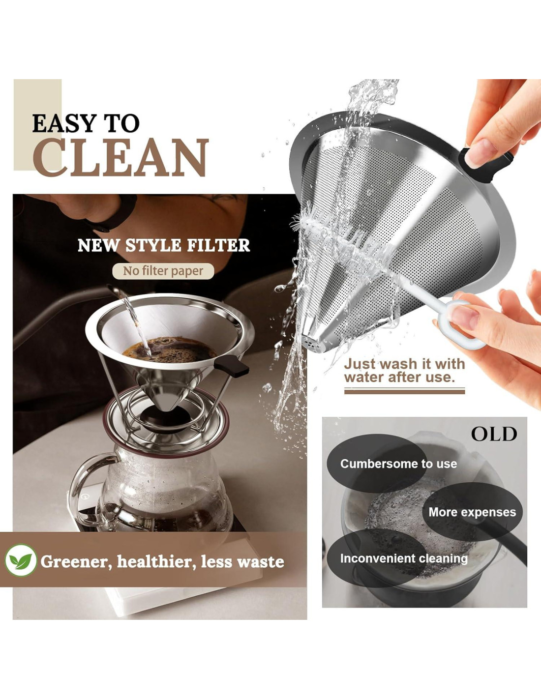- Ecológico y reutilizable. Hecho de acero inoxidable de alta calidad, este colador de café está diseñado para un uso repetido. Es fácil de limpiar: simplemente enjuágalo bajo agua corriente o colócalo en el lavavajillas. Con el cuidado adecuado, esta solución de goteo de café se puede usar indefinidamente, reduciendo residuos y ahorrando dinero.