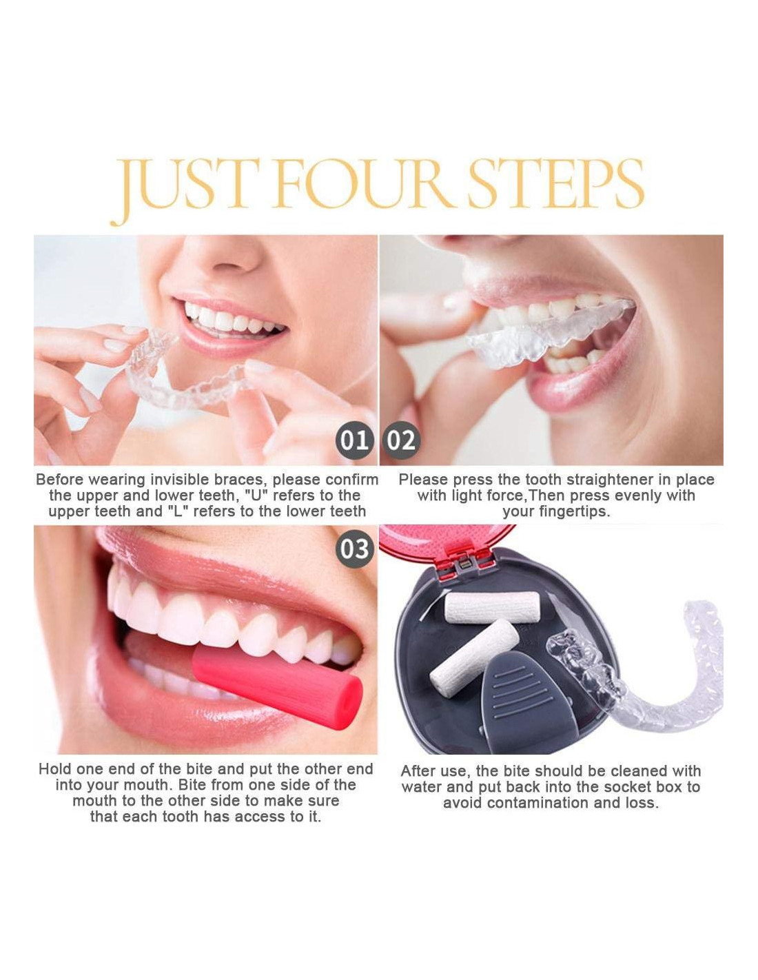 Características: Material de silicona de grado alimenticio, suave y resiliente, cómodo de usar. Ayuda a que la bandeja de alineadores se ajuste más cerca de los dientes para asegurar que se alcance la fuerza ortodóntica preestablecida, logrando mejores resultados en menos tiempo. Morder 10-15 minutos al día, para evitar la cara de alineador, que es un resultado desagradable debido a la corrección dental. Elimina el espacio entre los dientes y los frenos para hacer que los frenos sean más invisibles. Especificaciones: Material: Silicona de grado alimenticio Tamaño: aproximadamente 3.3 pulgadas (8.4 cm) de largo y 1.0 pulgadas (1.0 cm) de diámetro Color: blanco, rosa, verde, naranja, púrpura Cantidad: 10 piezas El paquete incluye: 10Pcs x Aligner chewies Método de uso: 1. Después de colocar las bandejas de invisalign en su lugar con la mano, sostenga un extremo del chewie y coloque el otro extremo en la boca para morder suavemente, de un lado de la boca al otro lado, para asegurar que cada diente sea mordido. 2. Usualmente al usar bandejas nuevas, los primeros tres a cinco días cada vez que use bandejas, use el pegamento de mordida durante 3 a 5 minutos, después de tres a cinco días, puede reducir el tiempo de uso, pero asegurándose de que las bandejas estén en su lugar. Asuntos que requieren atención: 1. Antes de usar los chewies, los aparatos ortodónticos deben estar en su lugar con la mano. Si muerde directamente sin una posición completa, puede causar daños a los aparatos ortodónticos o producir una fuerza ortodóntica incorrecta, lo que afectará el efecto del tratamiento ortodóntico en sentido contrario. 2. Después de usar los chewies, por favor, límpielo con agua limpia y colóquelo en la caja de chaqueta para protegerlo contra pérdidas y contaminación. Simplemente enjuáguelo cuando haya terminado y espere hasta la próxima vez. 3. Cuando los chewies pierden elasticidad o se rompen, deben ser reemplazados a tiempo.