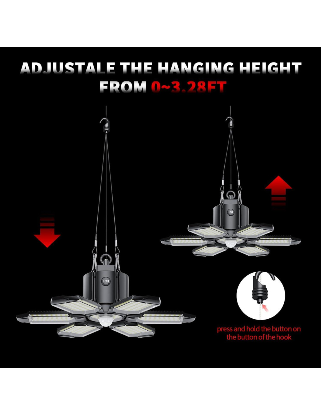 - 20000LM Brillante y Calidad Confiable: Con 312 chips LED de ahorro de energía incorporados y con 6 paneles laterales + 1 panel central, las luces LED de garaje enchufadas proporcionan una salida total de 200W y un brillo de 20,000 lúmenes a una luz diurna de 5000K. Ofrece la mejor experiencia de iluminación interior. Equipado con la última tecnología LED y un controlador de corriente constante estable, hasta 50,000 horas de vida útil, asegura un rendimiento duradero.