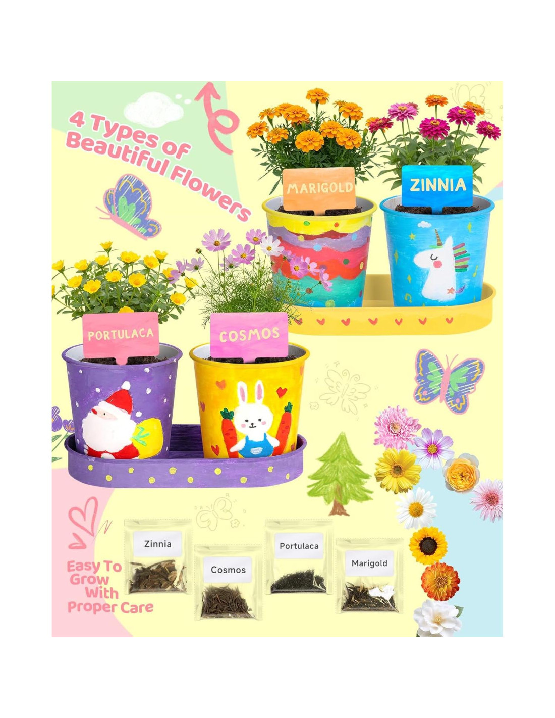 - Conjunto completo de artes y manualidades: 4 macetas de siembra, conjunto de herramientas de pala, botella de spray, 4 etiquetas para plantas, 4 estacas de mariposa, 12 colores de pinturas acrílicas, 2 pinceles, paleta de pintura, manual y caja de regalo. Incluye todo lo que necesitas.
