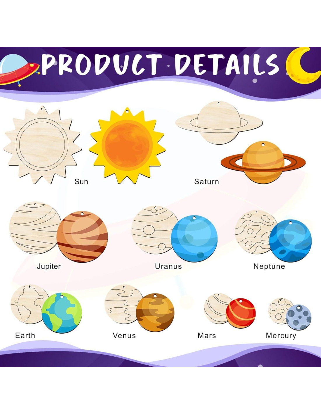 - Componentes incluidos: 8 recortes de madera de astronauta sin terminar, 1 kit de ornamento colgante del sistema solar de madera DIY (1 disco, 8 planetas), 20 tubos de campana de viento, 8 cuerdas de color, 25 alambres plateados, 1 hoja de pegatinas de rhinestone